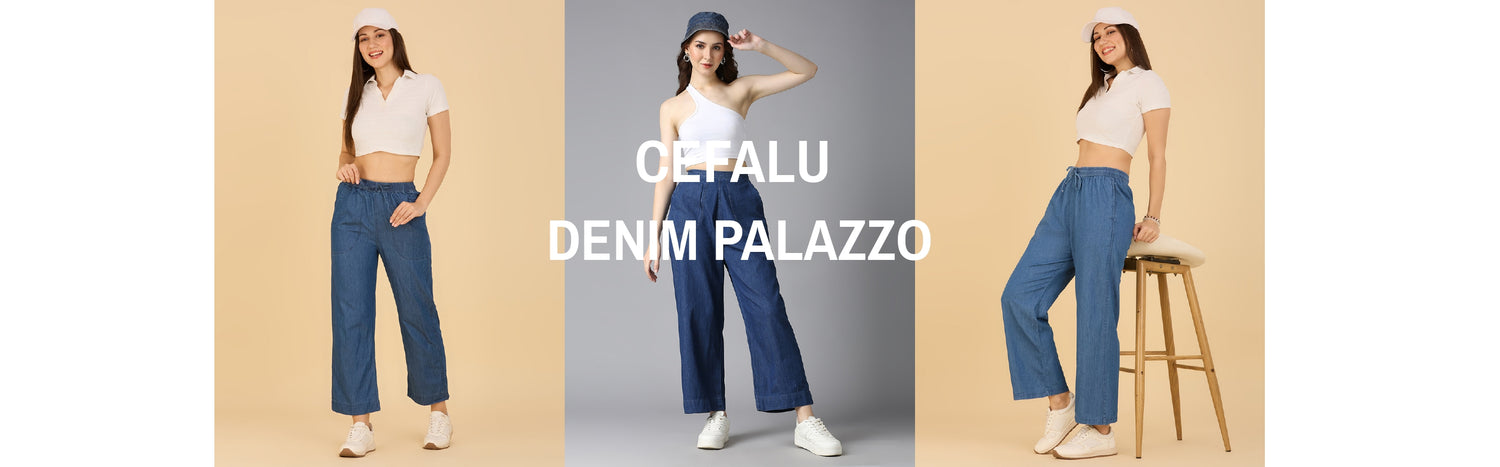 DENIM PALAZZO WITH ELASTICATED WAIST & INVISIBLE DRAWSTRING, POCKETS