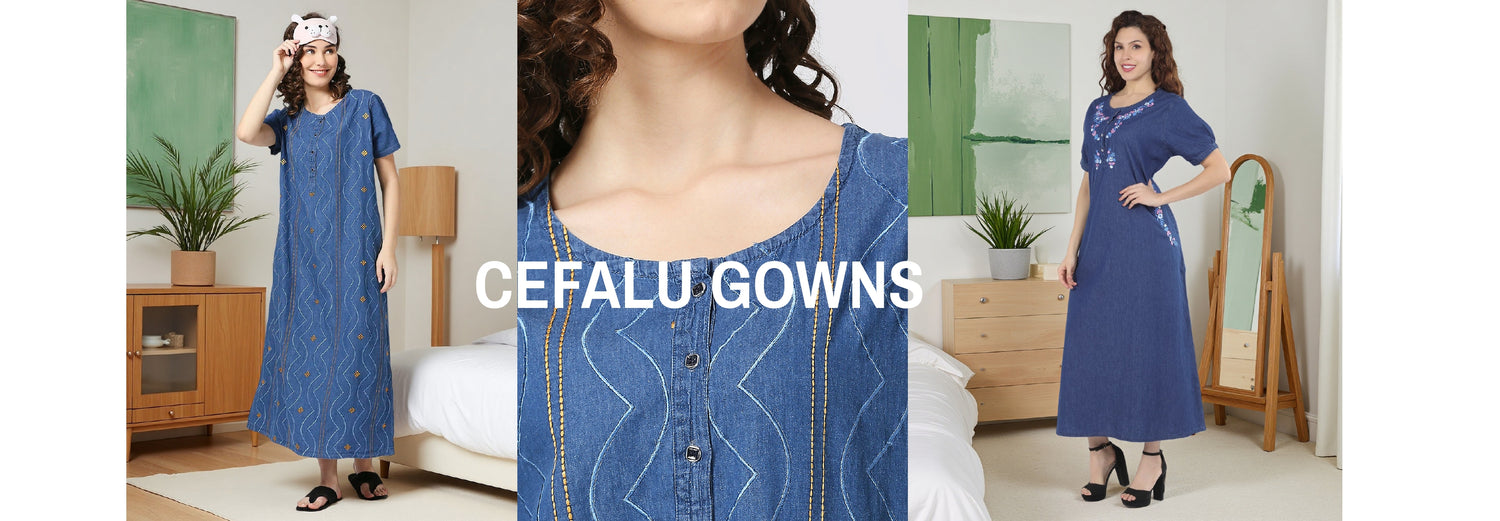 Denim Gown- Embroidered Nighty with Pockets, Womens Denim Long Gown