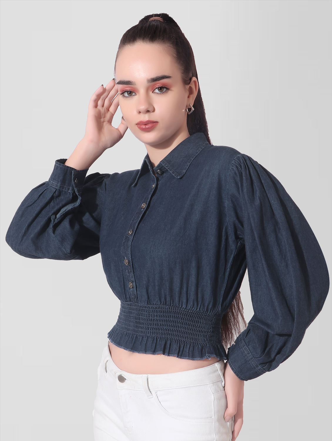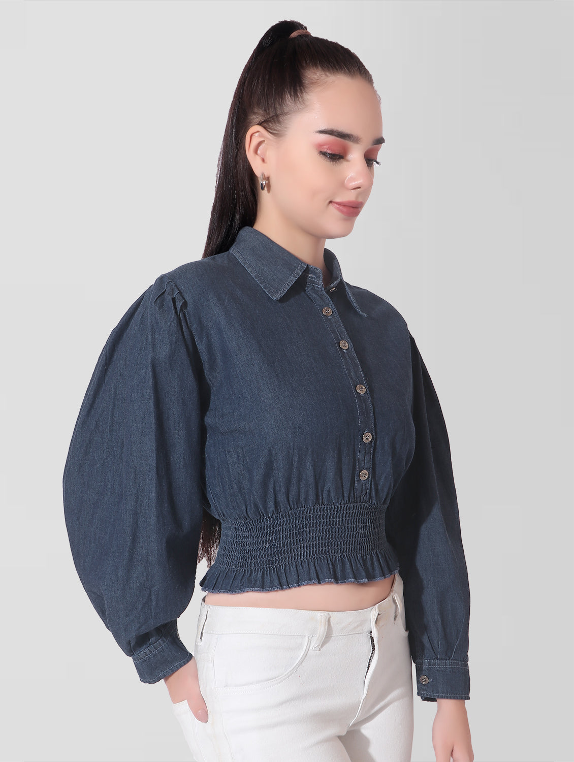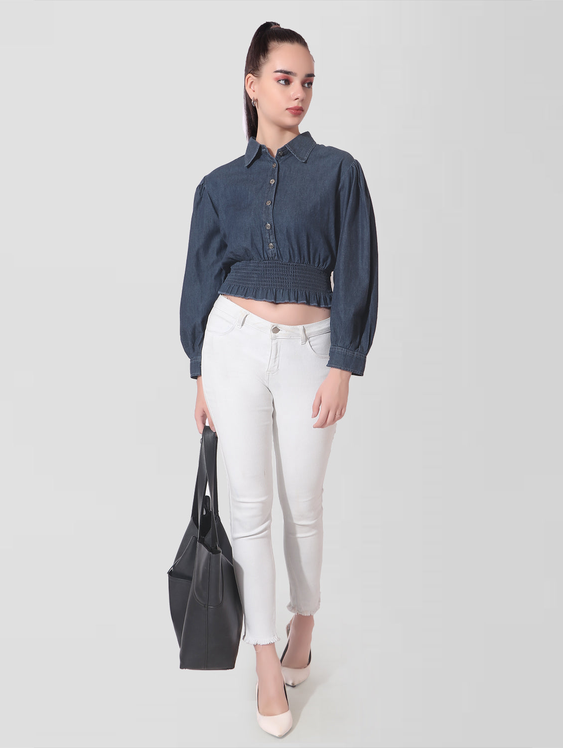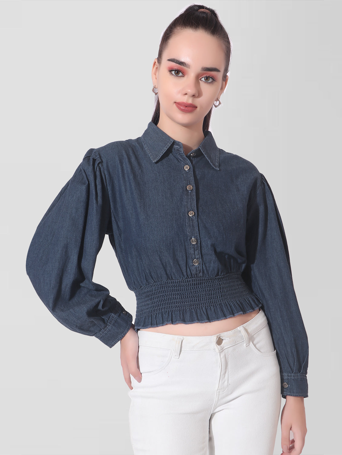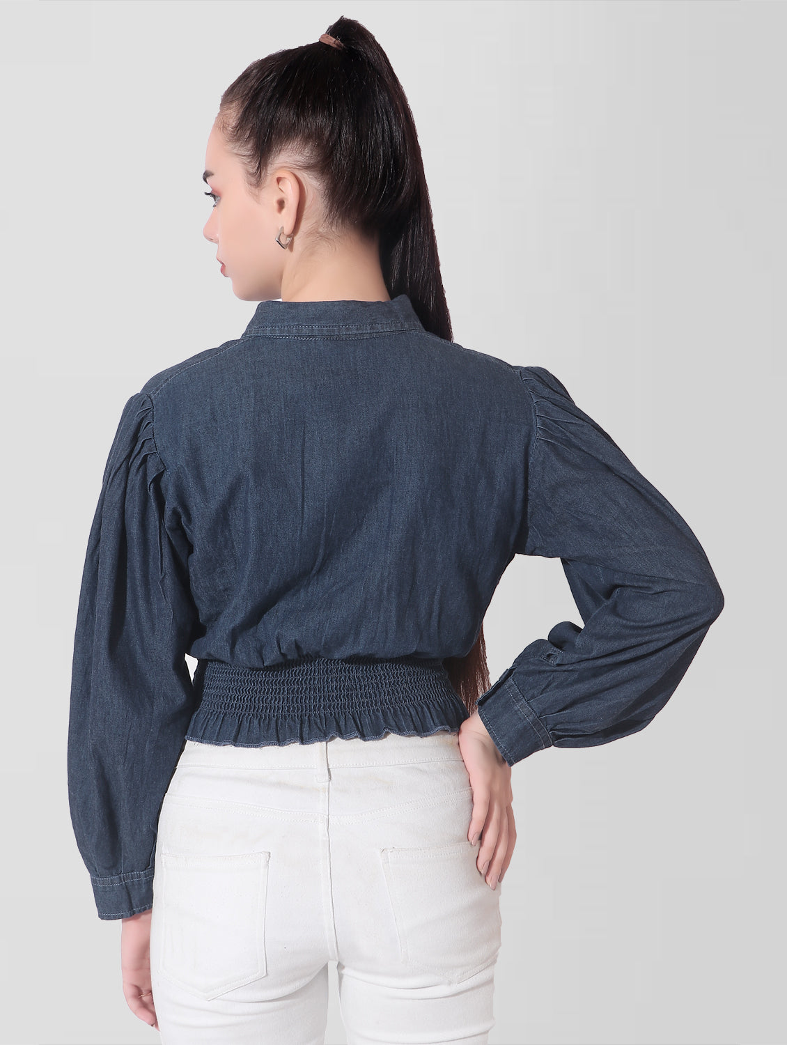 This Beautiful Denim Top features a full button with smokky waist belt, giving it a contemporary and stylish look. The full sleeves and collared neck make this top perfect for all-day comfort. Its regular fit, blue color and solid design add to its trendiness. Perfect for all seasons.