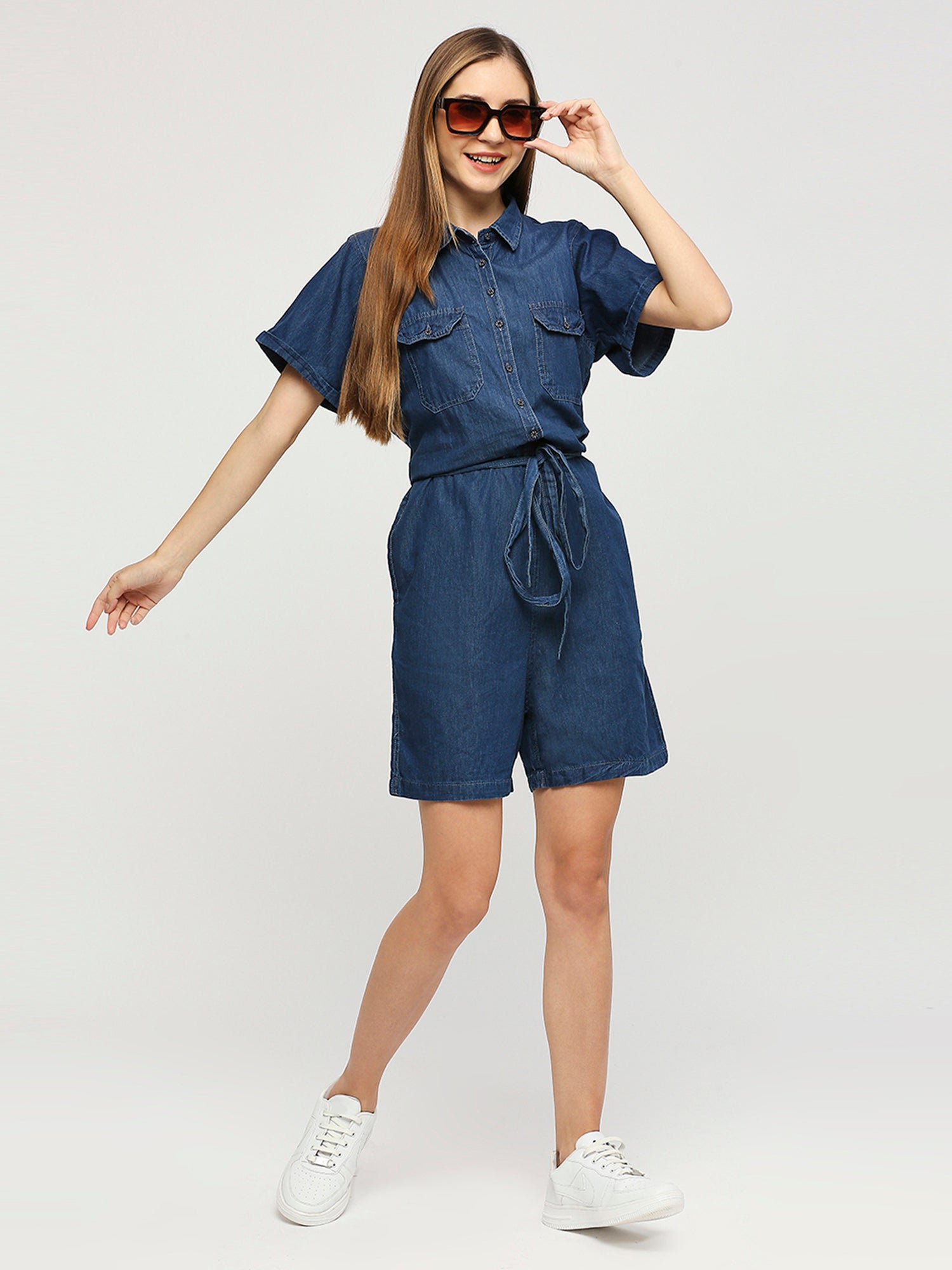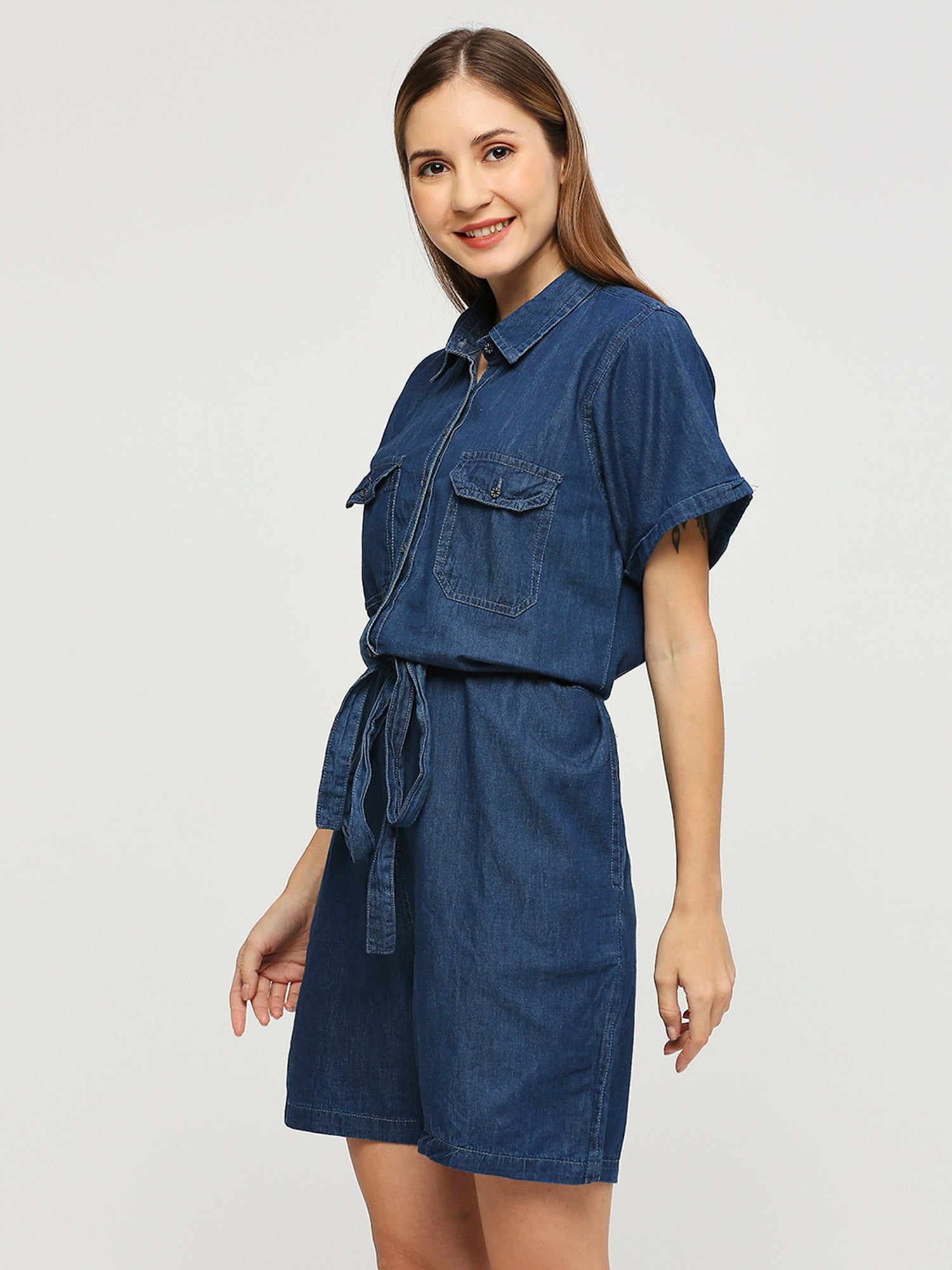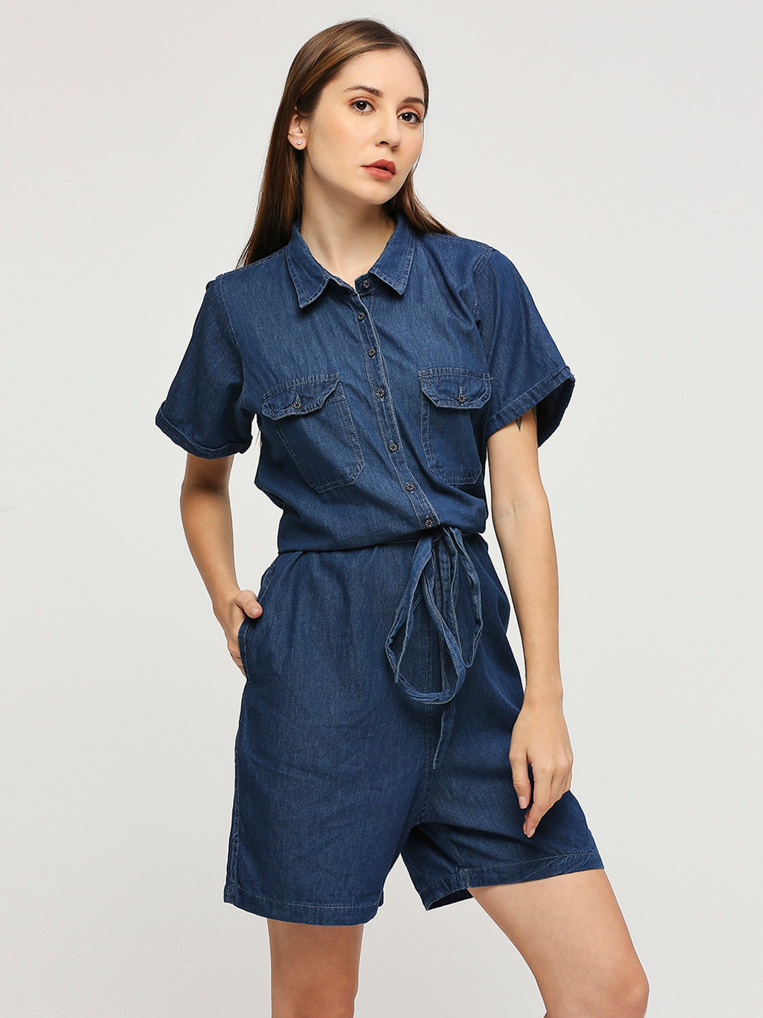 Upgrade your wardrobe with the stylish and comfortable Cefalu BLUE Denim half jumpsuit shorts Dress. Featuring a spread collar and folded sleeves, this slim fit jumpsuit is perfect for regular and party wear. Made with quality denim, it's also easy to care for. Available in a knee-length and solid pattern, this Women's Jumpsuit is a must-have for any fashion-forward individual.
