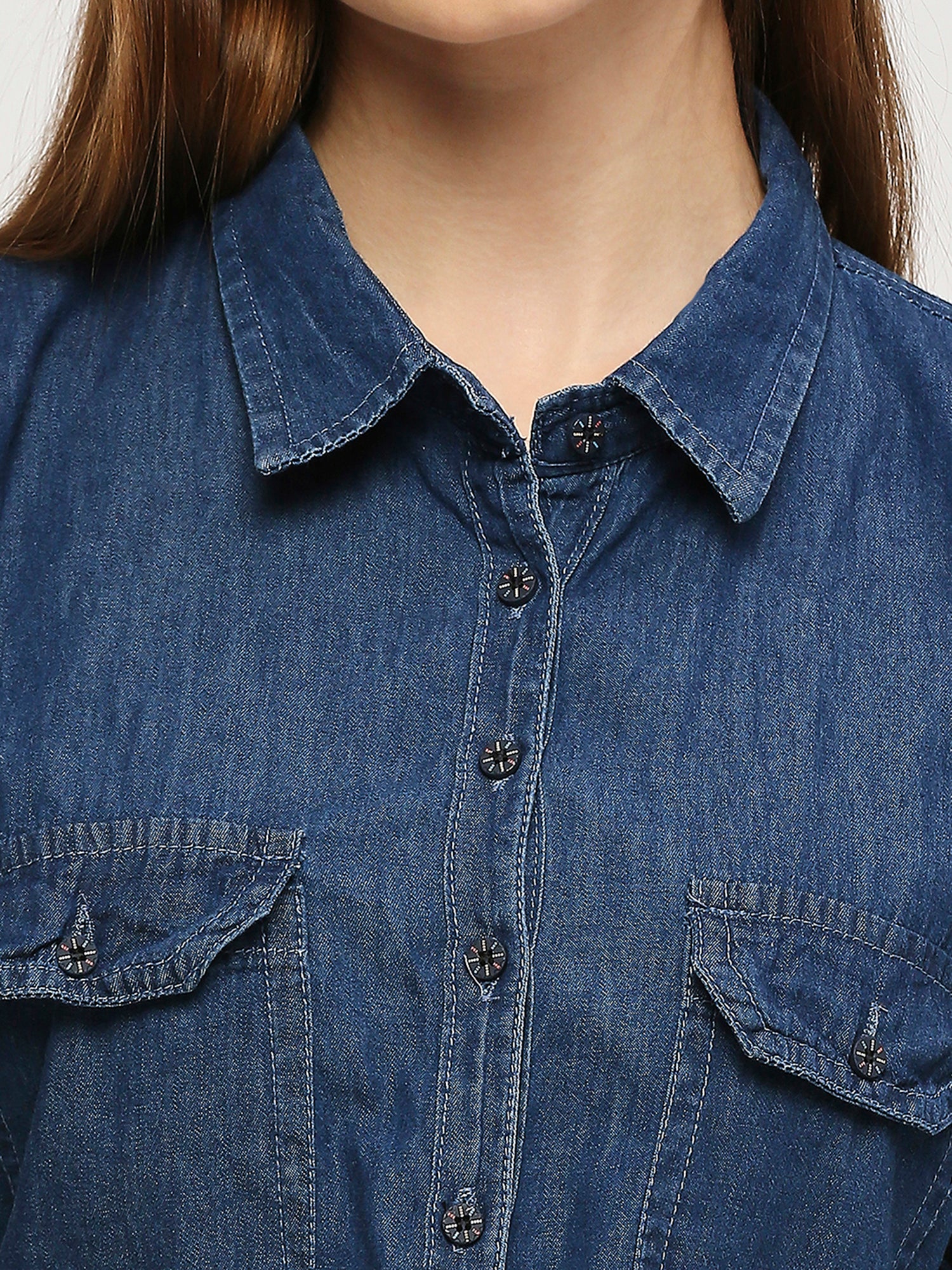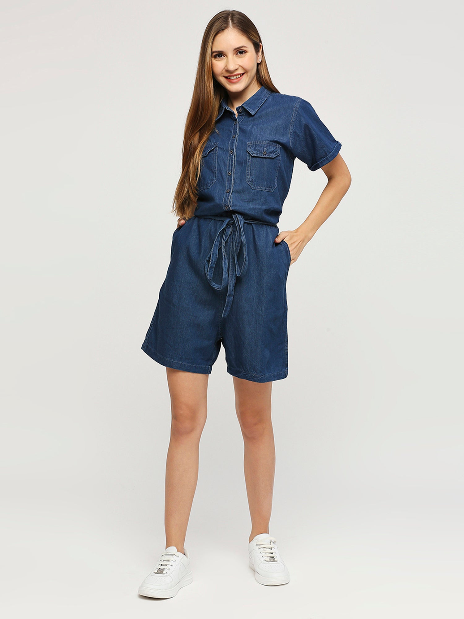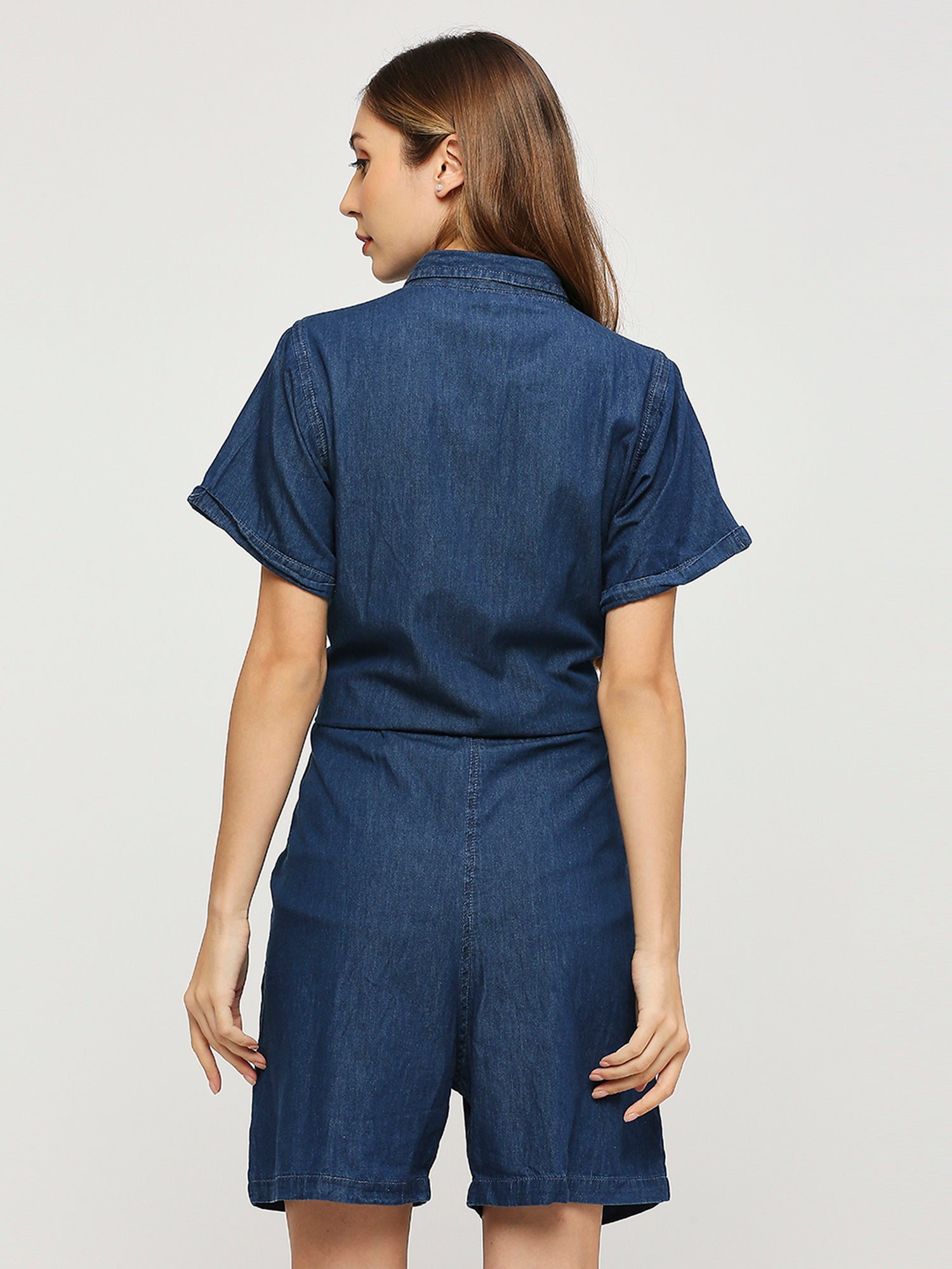 Upgrade your wardrobe with the stylish and comfortable Cefalu BLUE Denim half jumpsuit shorts Dress. Featuring a spread collar and folded sleeves, this slim fit jumpsuit is perfect for regular and party wear. Made with quality denim, it's also easy to care for. Available in a knee-length and solid pattern, this Women's Jumpsuit is a must-have for any fashion-forward individual.