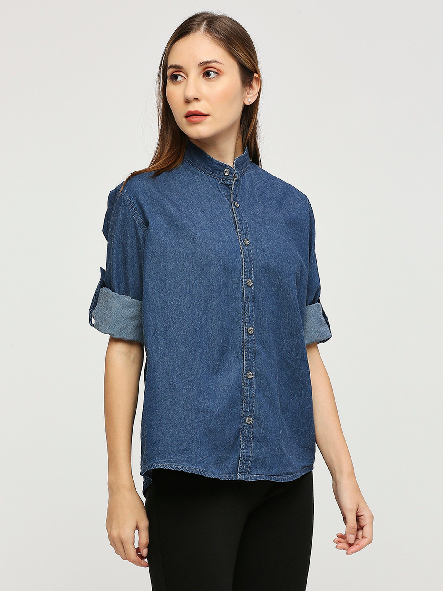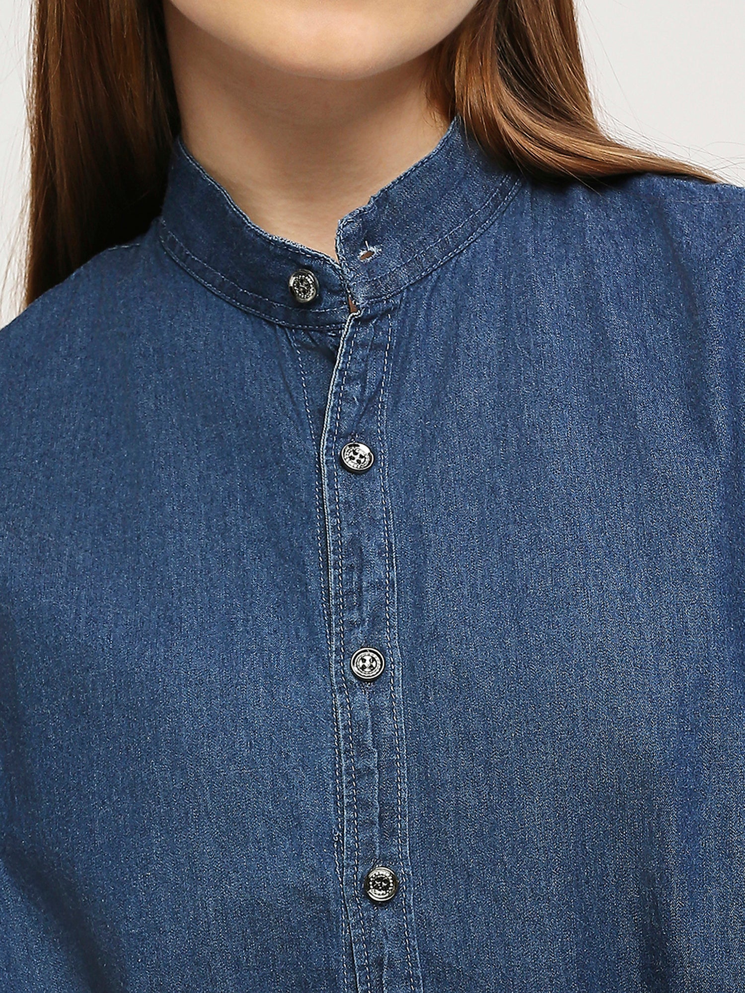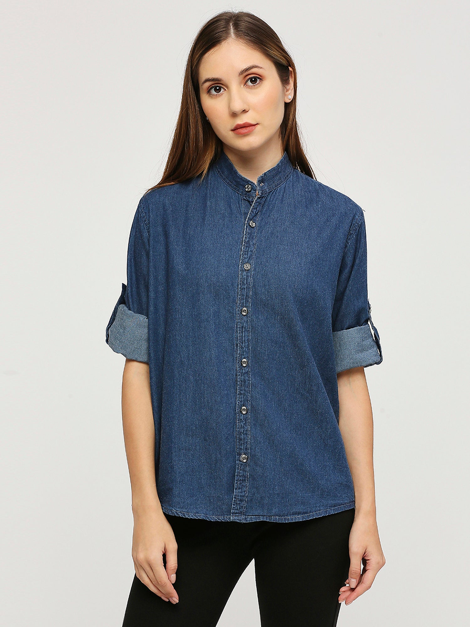 Stay stylish and comfortable in our Cefalu denim oversized shirt for women. Made from soft cotton denim fabric, this loose fitting shirt features a Mandarin collar and full sleeves for a sophisticated look. Perfect for any occasion, this button-down shirt is a must-have for your wardrobe.