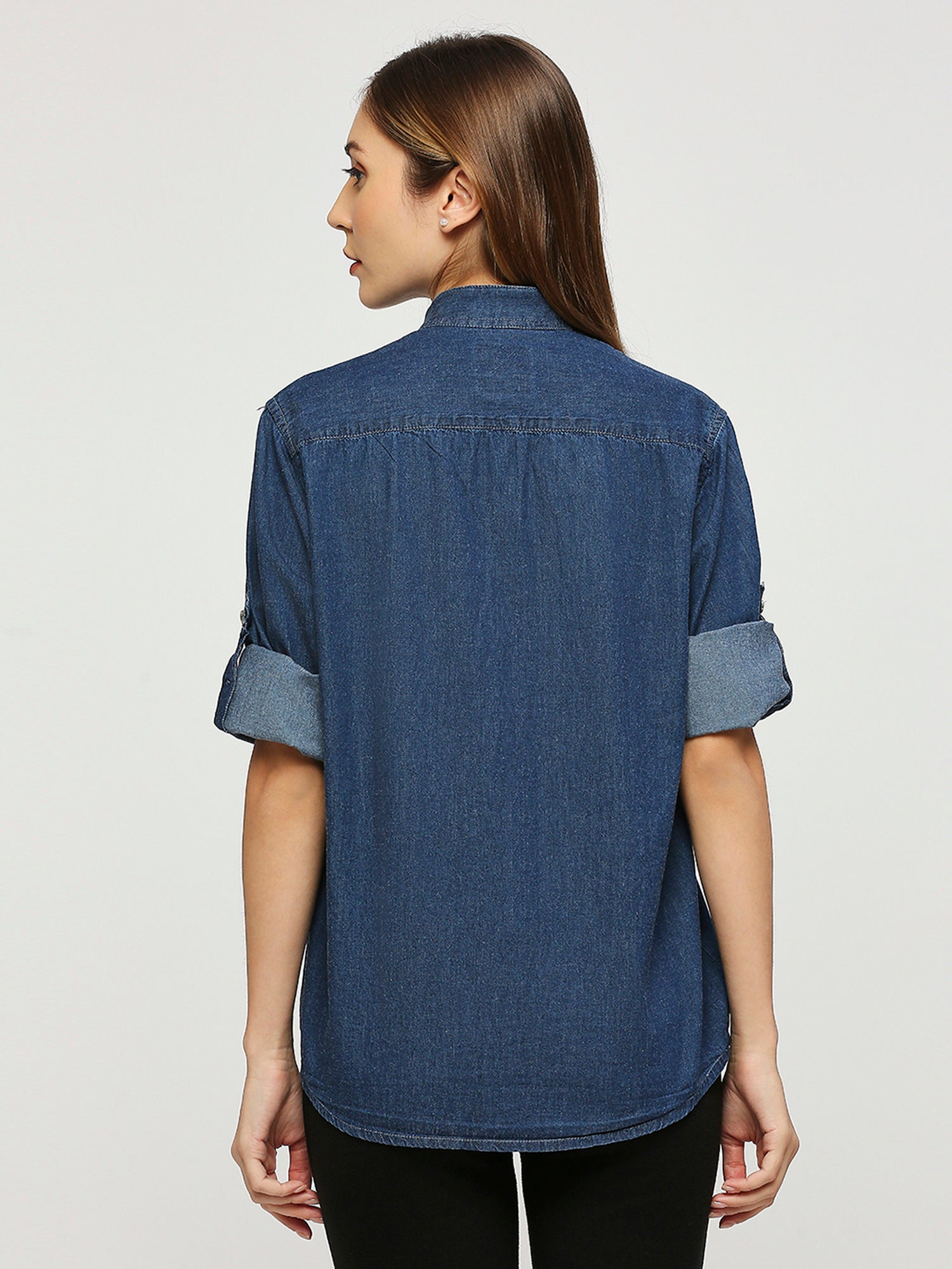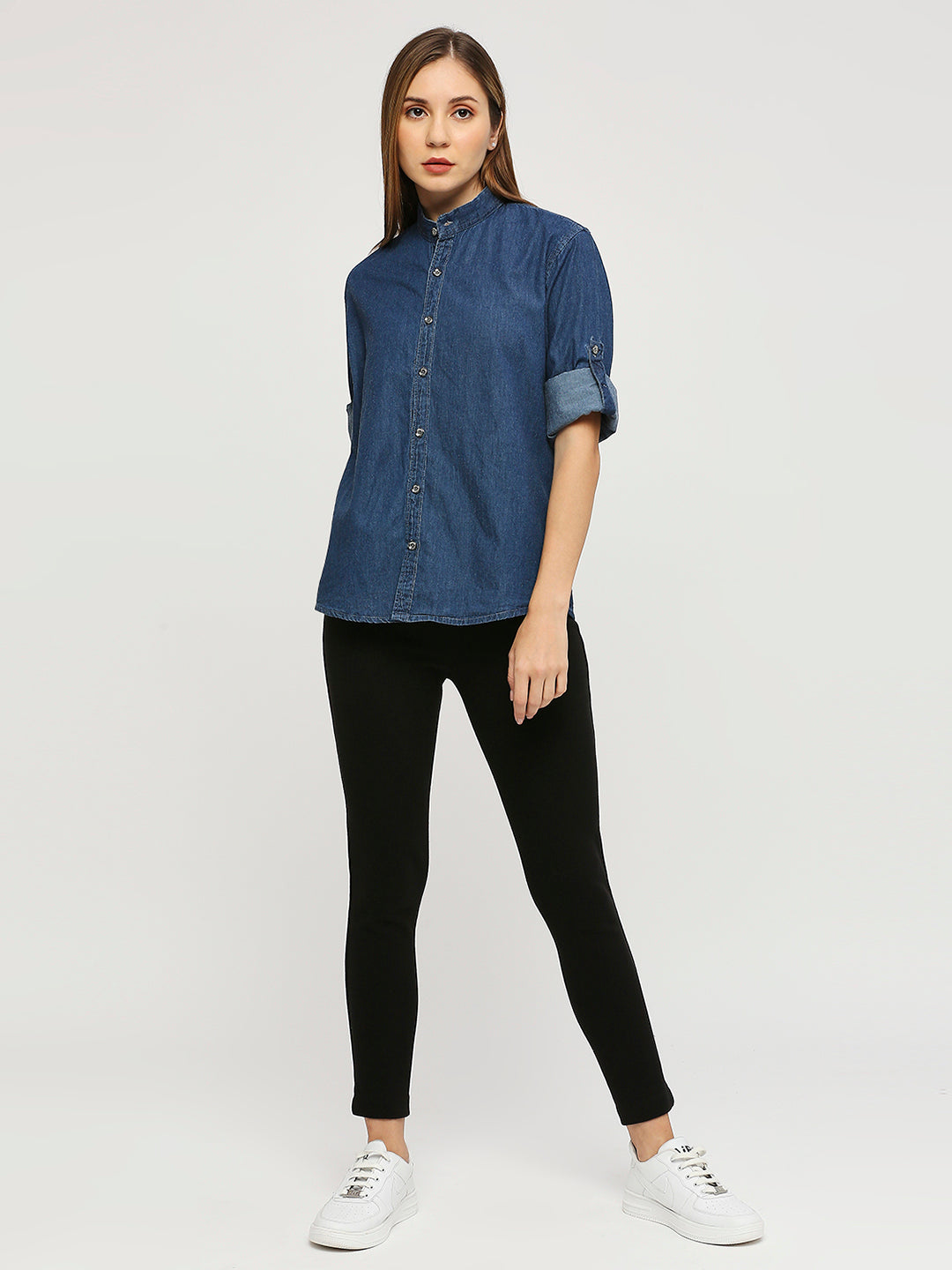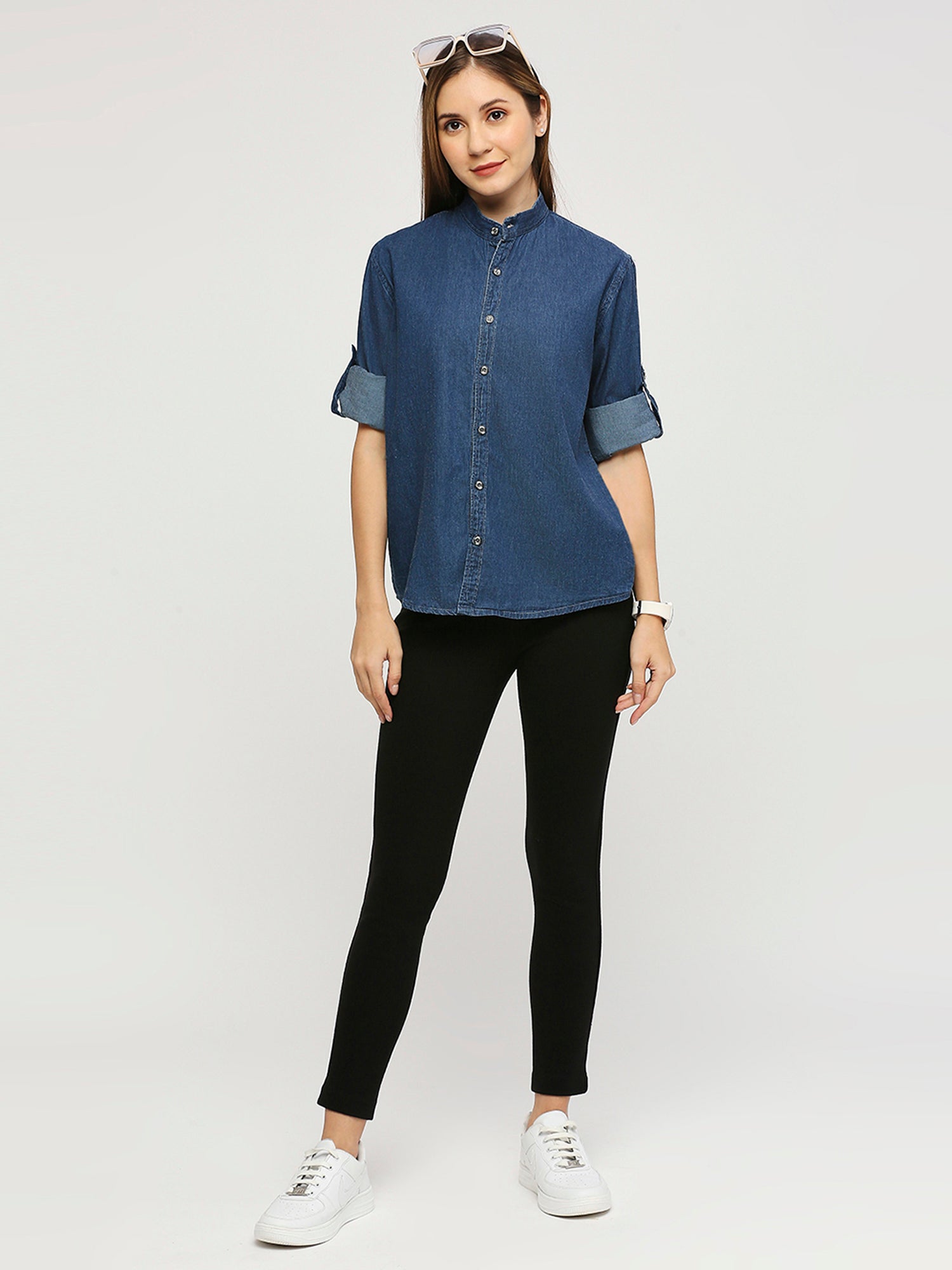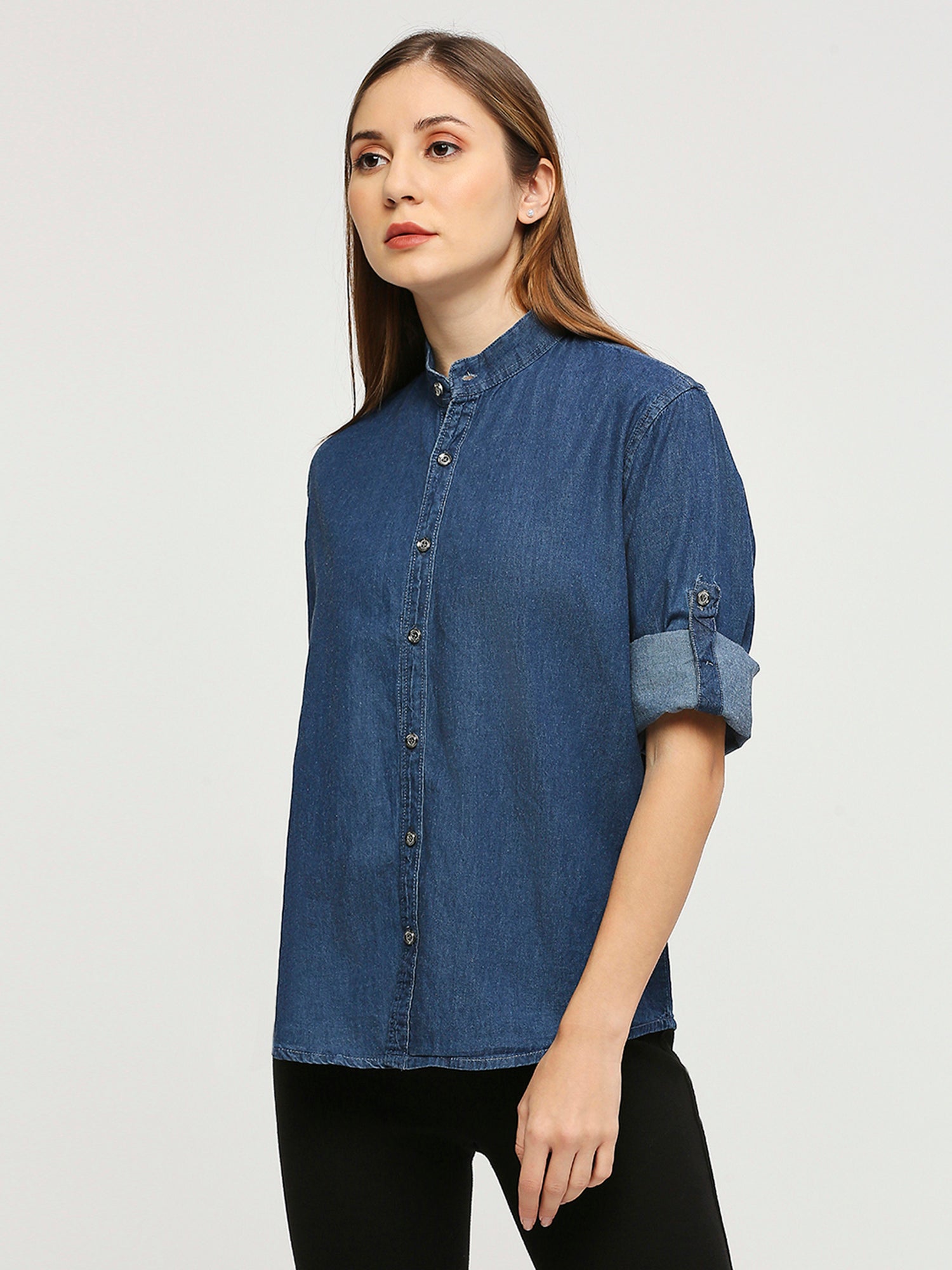 Stay stylish and comfortable in our Cefalu denim oversized shirt for women. Made from soft cotton denim fabric, this loose fitting shirt features a Mandarin collar and full sleeves for a sophisticated look. Perfect for any occasion, this button-down shirt is a must-have for your wardrobe.