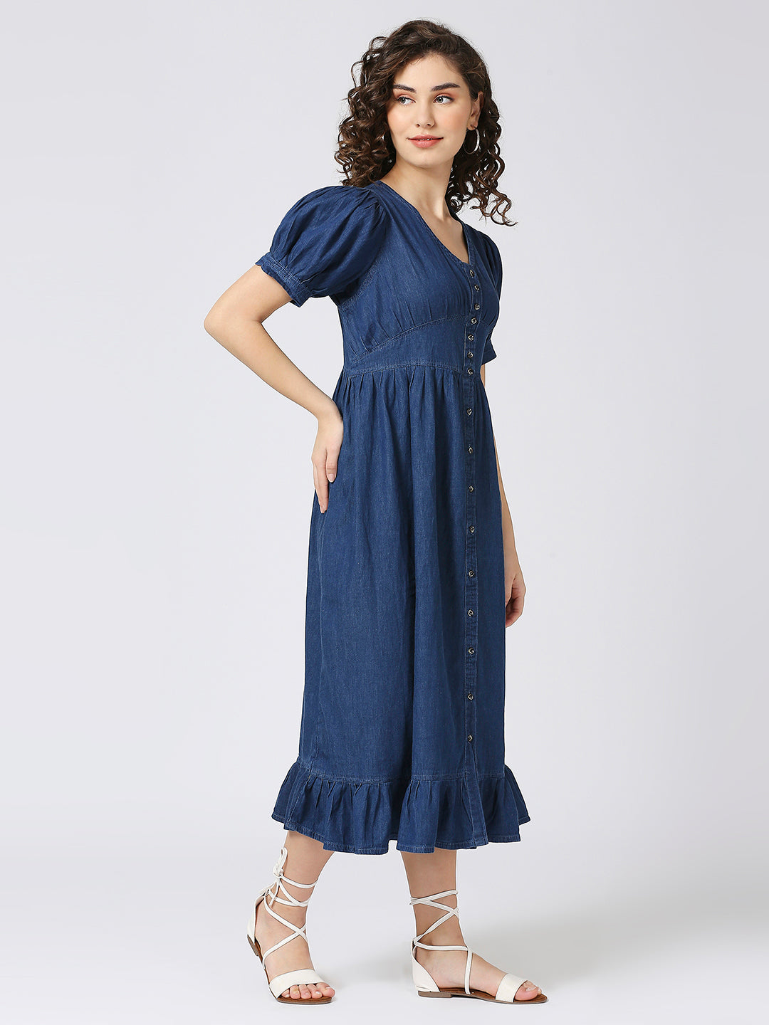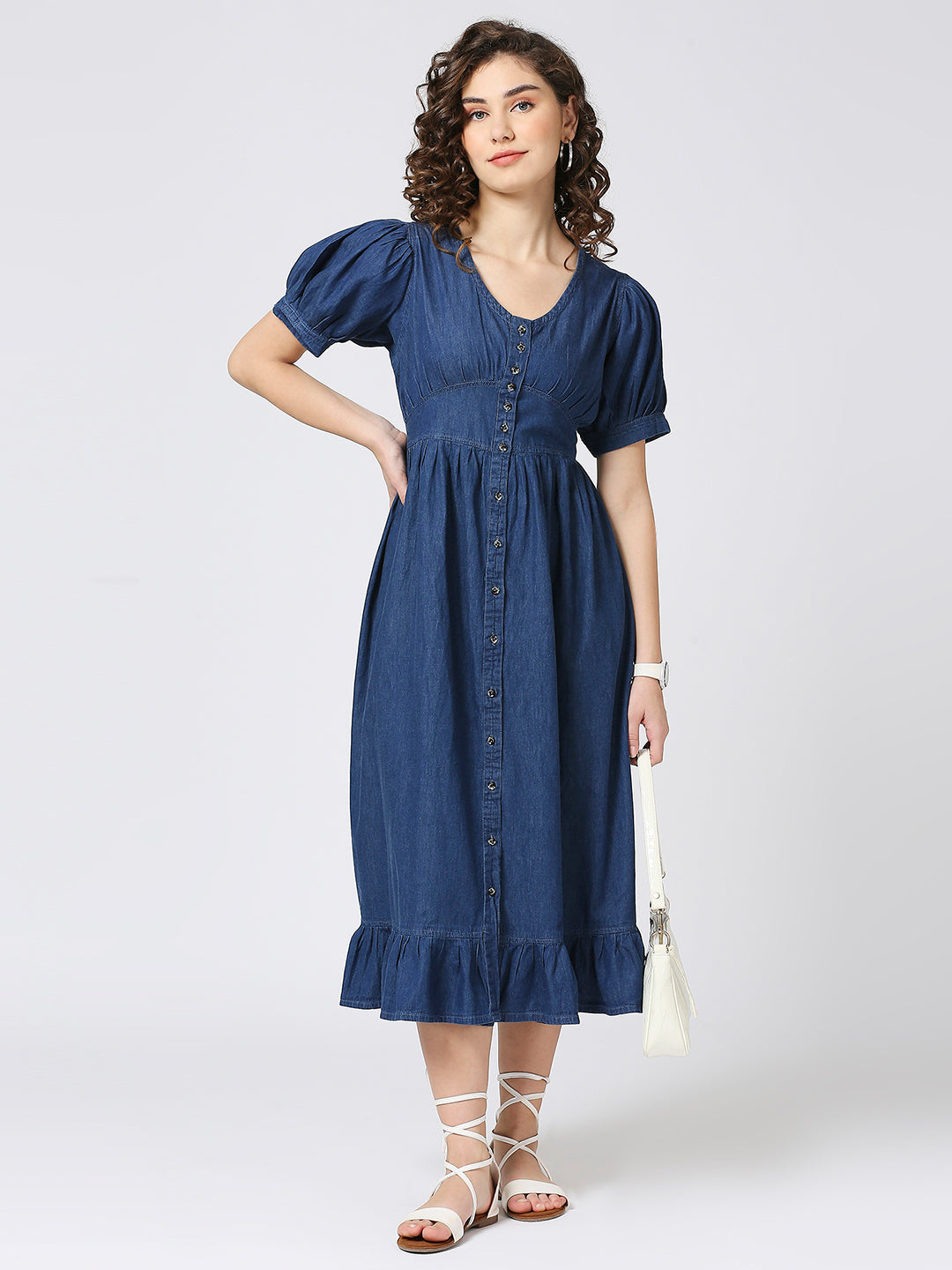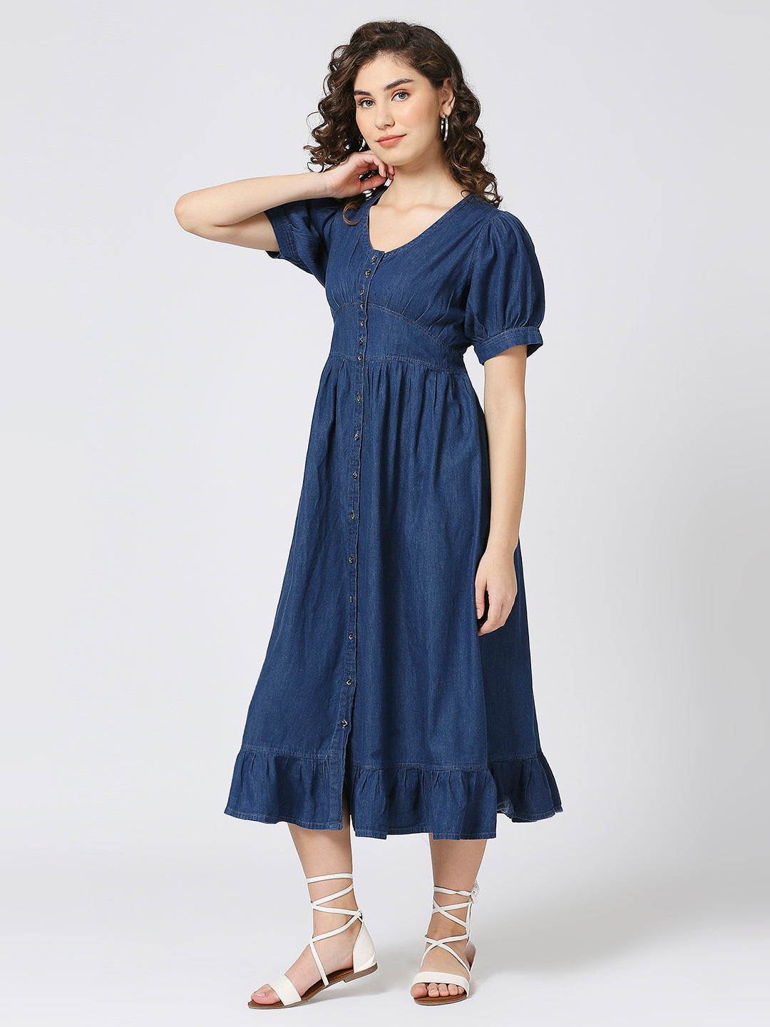 Denim Long Dress with Ballon Sleeves and Front Button Down Pattern