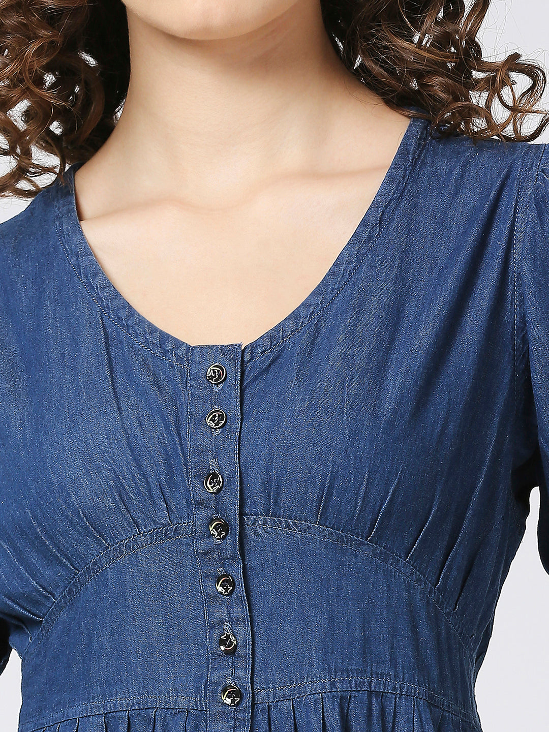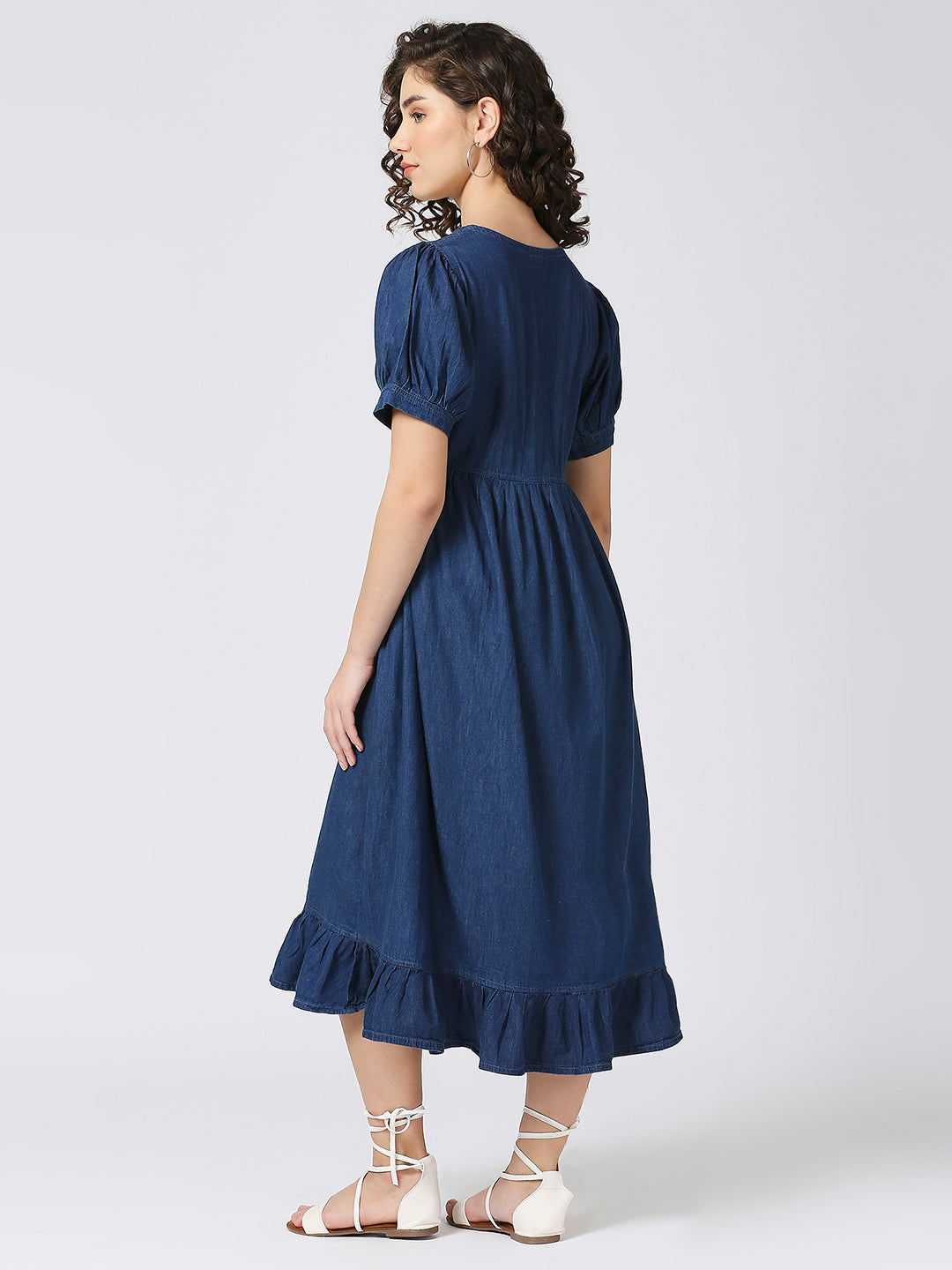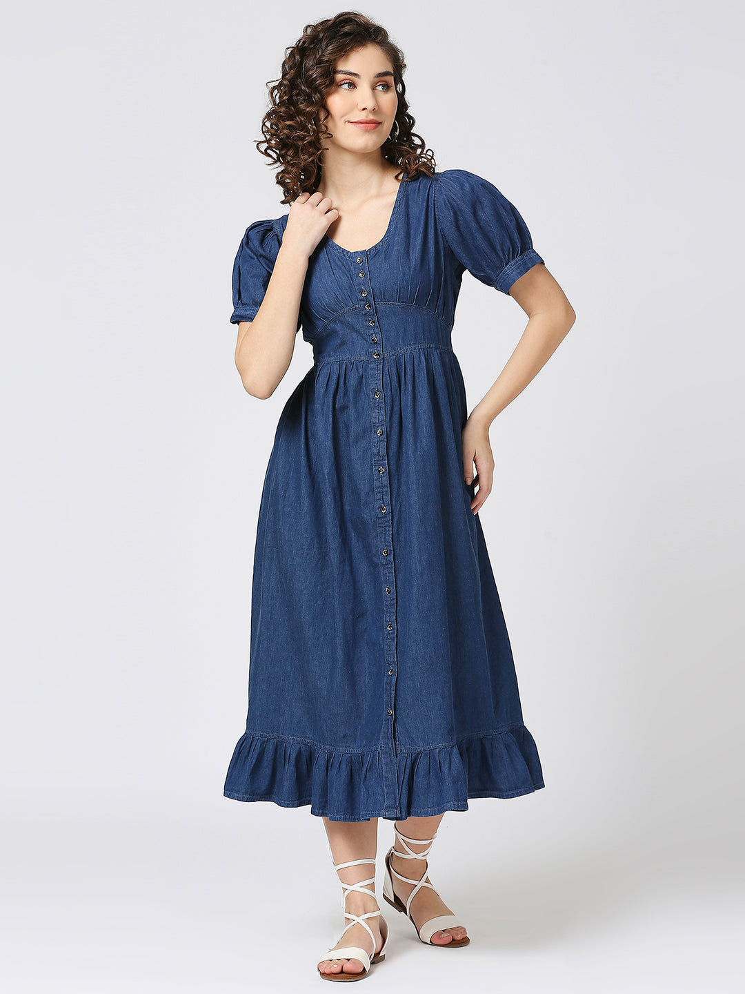 This Cefalu Soft Cotton Denim Long Dress is a versatile addition to any wardrobe. The A-line silhouette flatters all body types and the balloon sleeves add a touch of elegance. With a front button down pattern, this dress is perfect for any occasion. Elevate your ethnic wear game with this maxi dress!