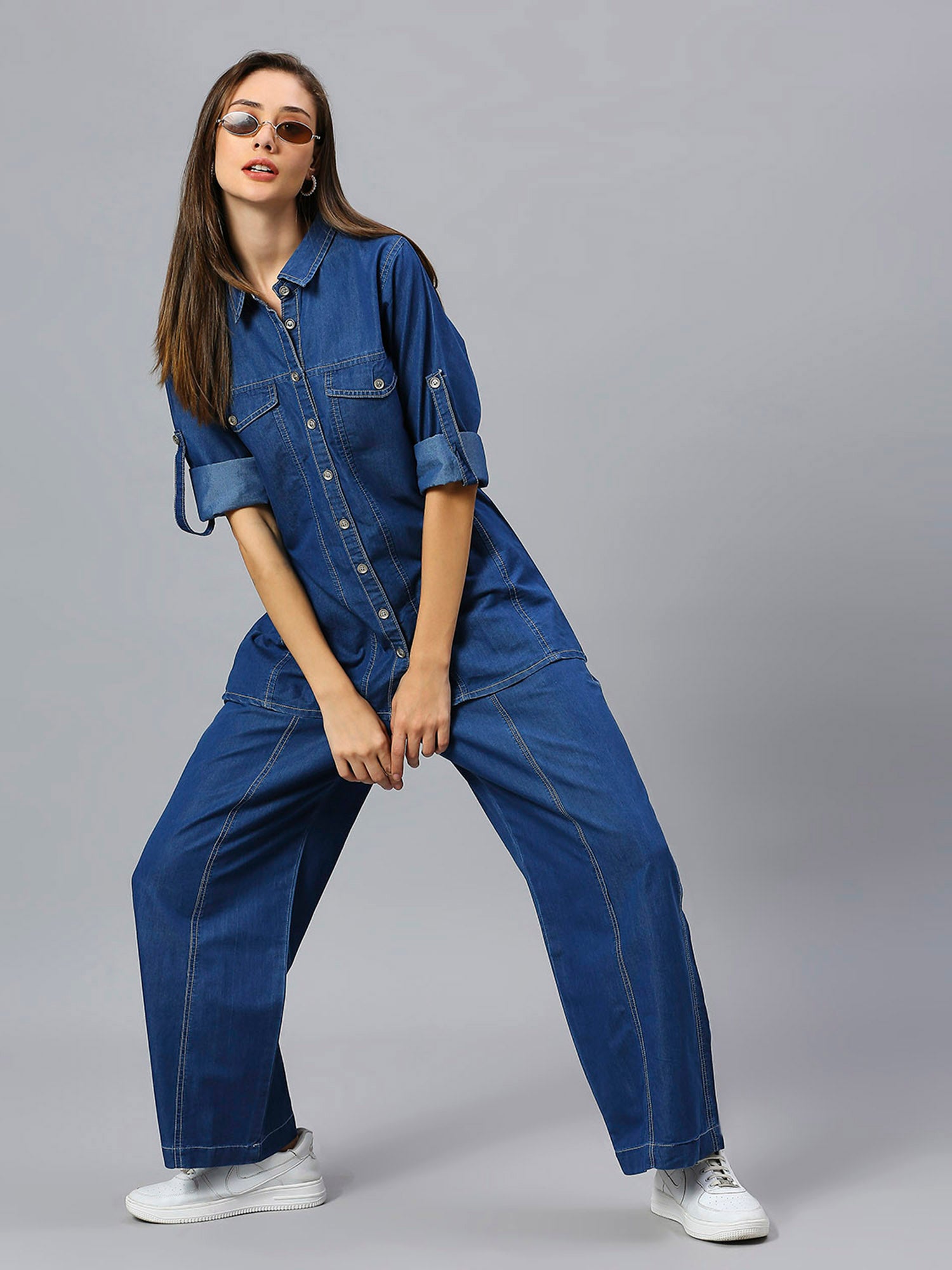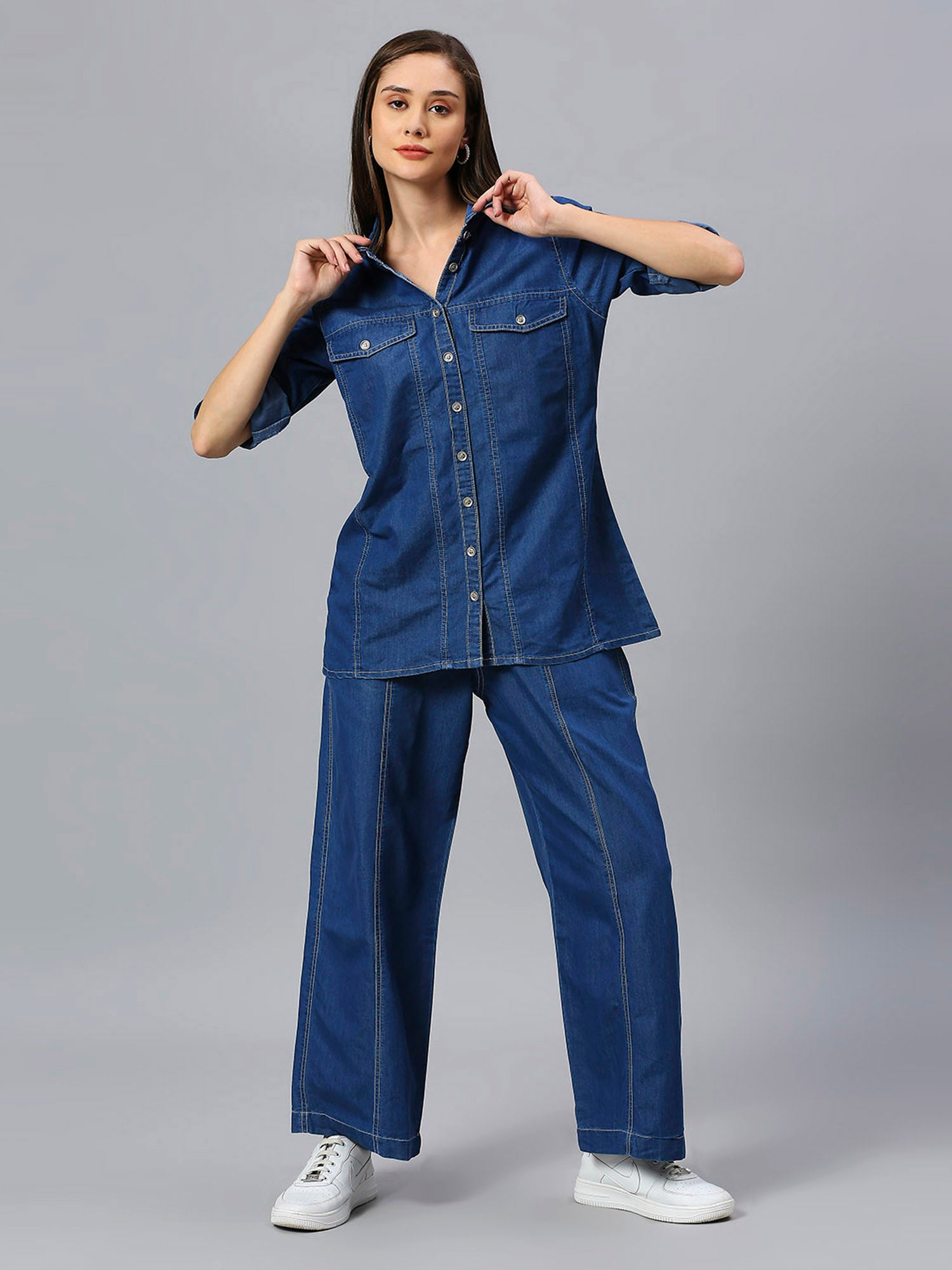 A chic and versatile denim shirt and pant style co-ord set for women, perfect for effortless casual elegance. Crafted from premium denim fabric, this set features a classic button-down shirt with a tailored fit, paired with coordinating straight-leg pants for a modern twist. Ideal for both day and evening wear, this ensemble exudes timeless style with a contemporary edge