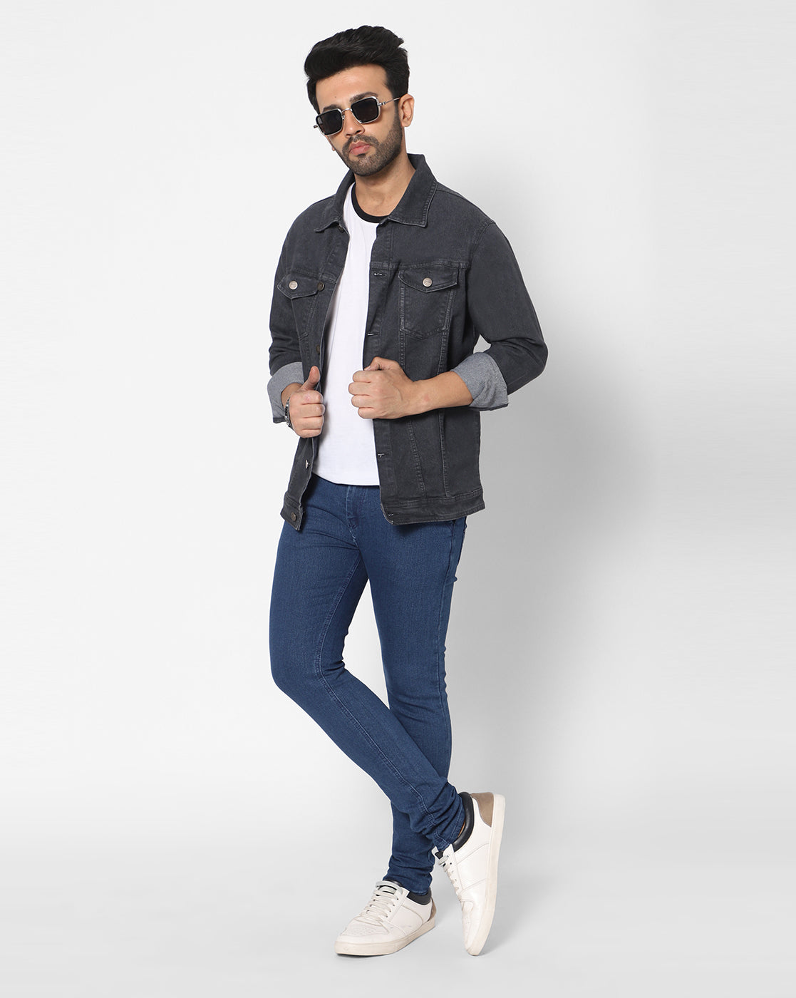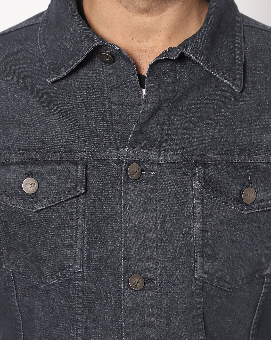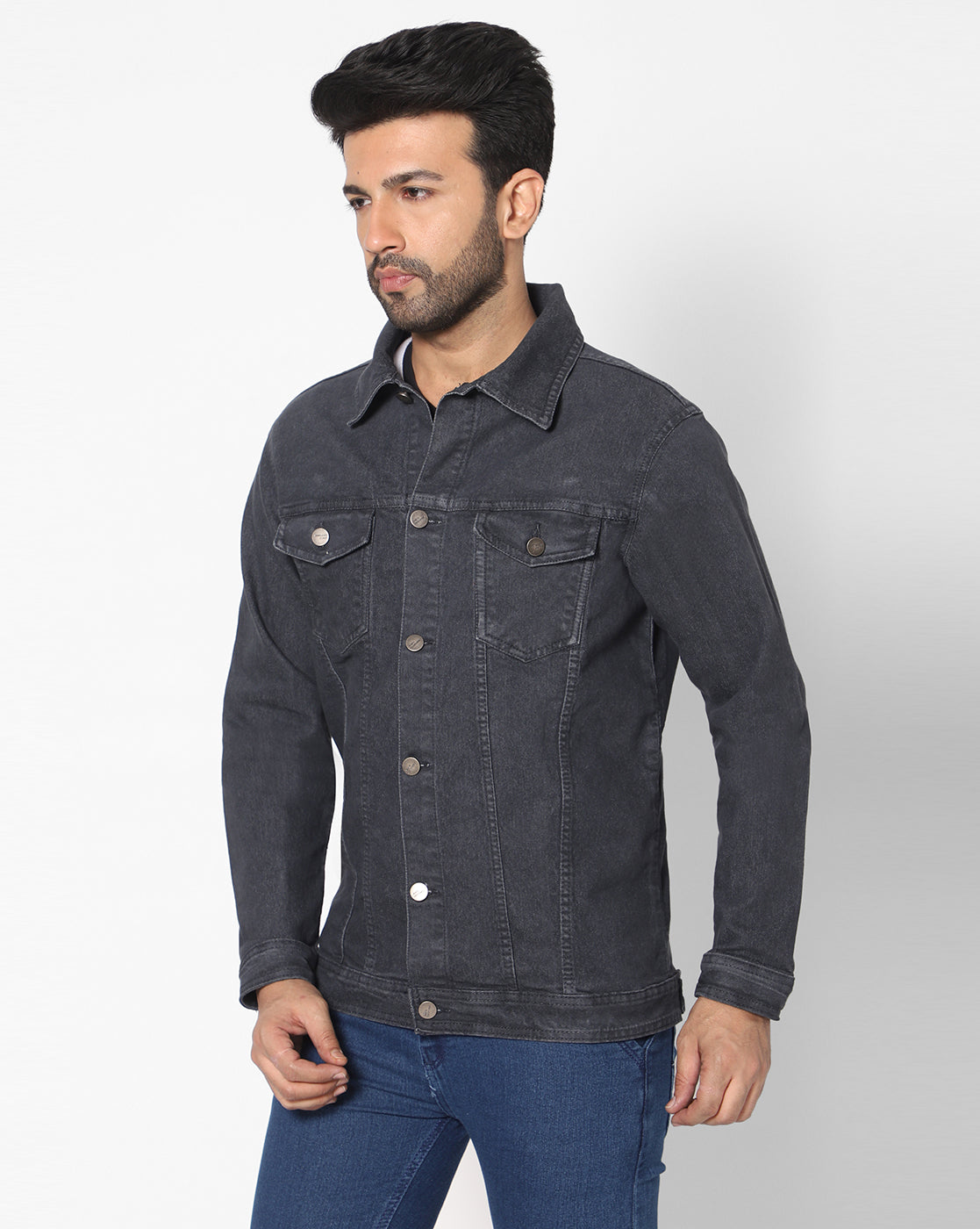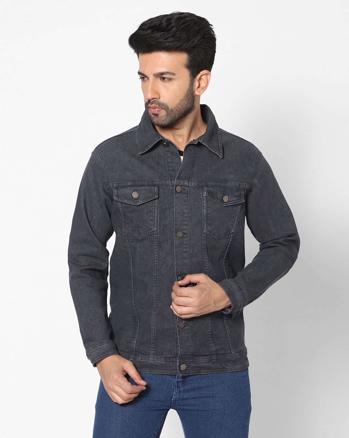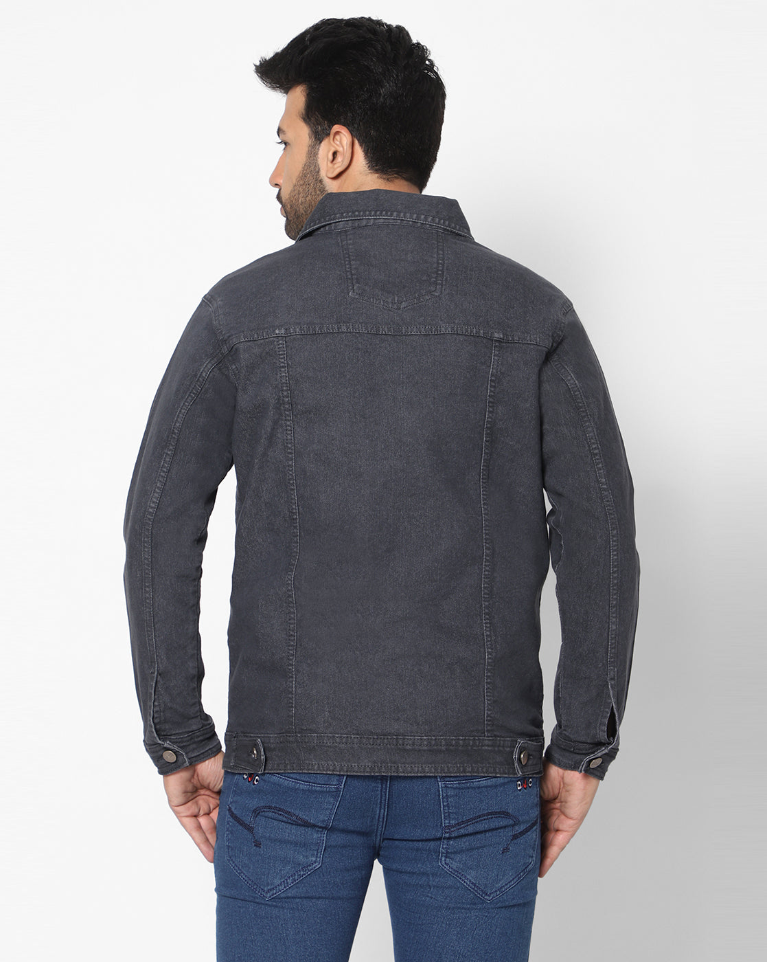 Introducing our Men's Dark Gray Cotton Jacket, designed for both comfort and style. This regular fit jacket features full sleeves and stretchable fabric for ease of movement. The shirt collar and two folded pockets add a touch of sophistication. Perfect for any occasion, this dark gray denim jacket is a must-have in any man's wardrobe.