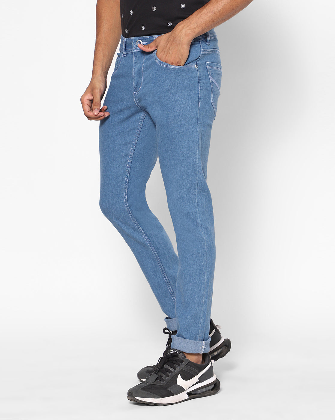 Introducing Denim World's stretchable Cotton fabric Jeans in Light Blue, featuring a regular fit and solid design. With 5 pockets, a mid rise, and dyed washed pattern, these jeans offer both style and comfort. The zip fly with button closure and durable, stretchable fabric make these perfect for any man's wardrobe.