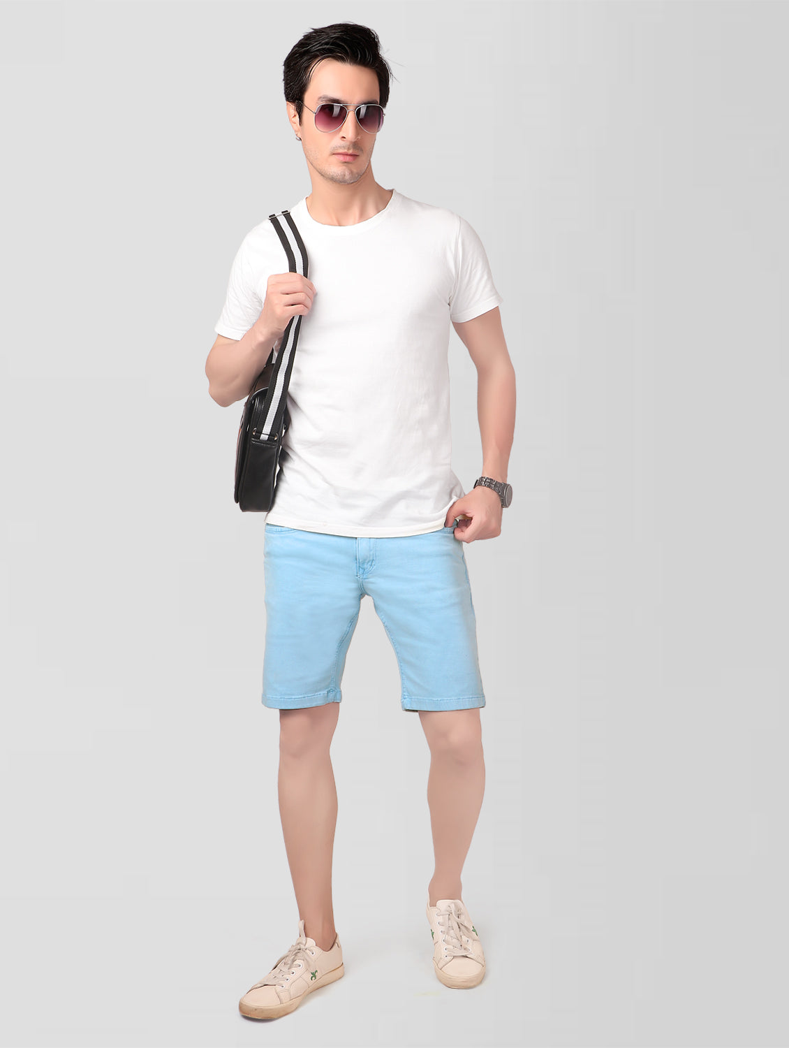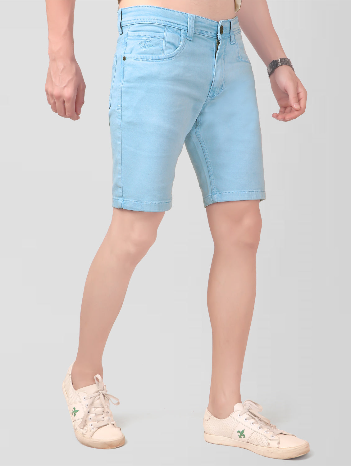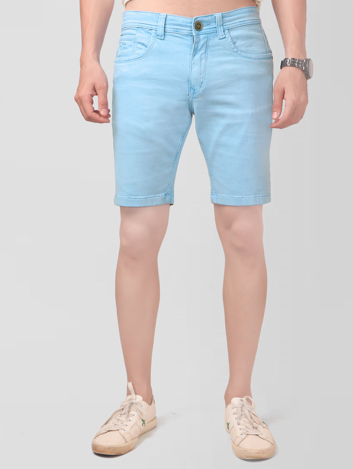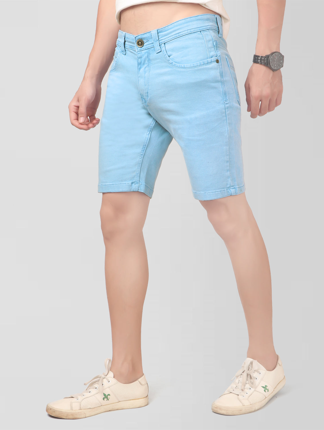 Shop these versatile Men Light Blue Regular Shorts from TCI. Made from stretchable cotton fabric, these shorts offer comfort and durability. Featuring 5 pockets, a zip fly with button closure, and a brand patch on the back waistband, these mid-rise shorts are perfect for everyday wear.