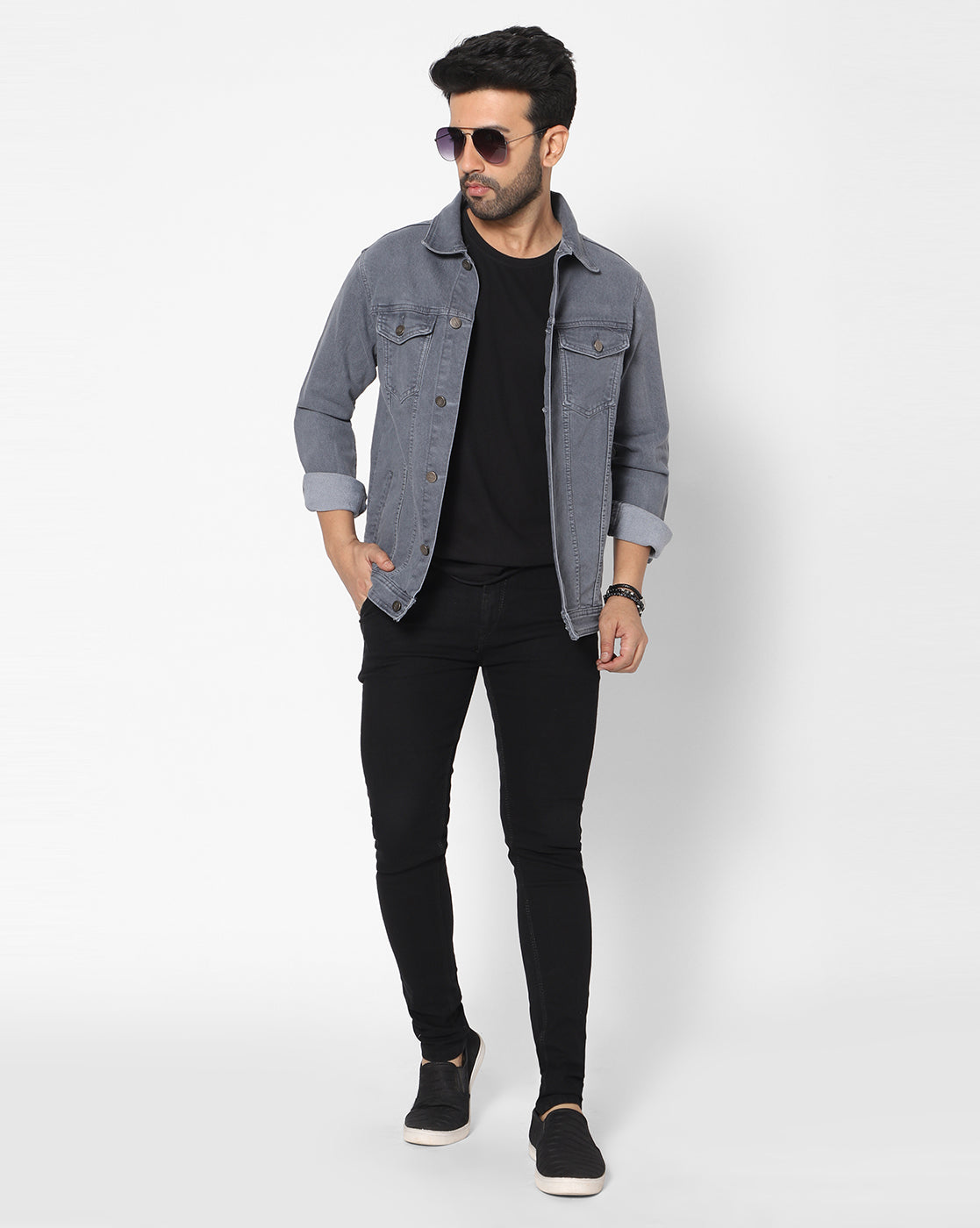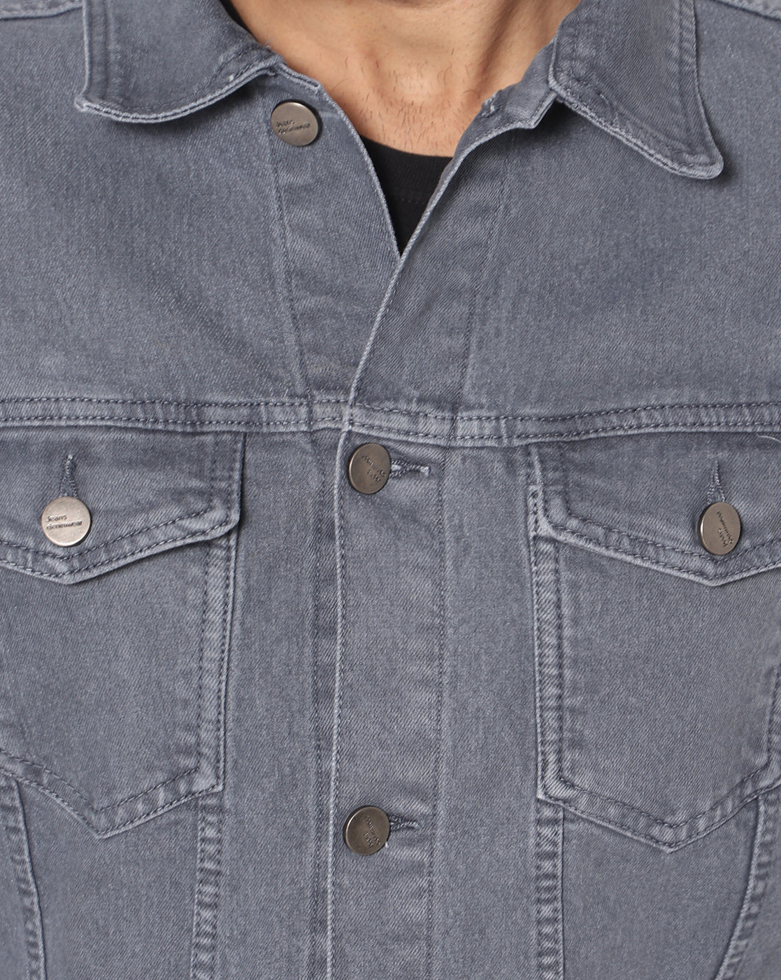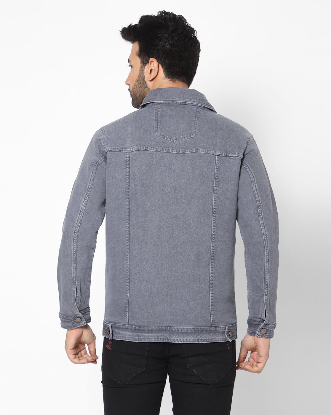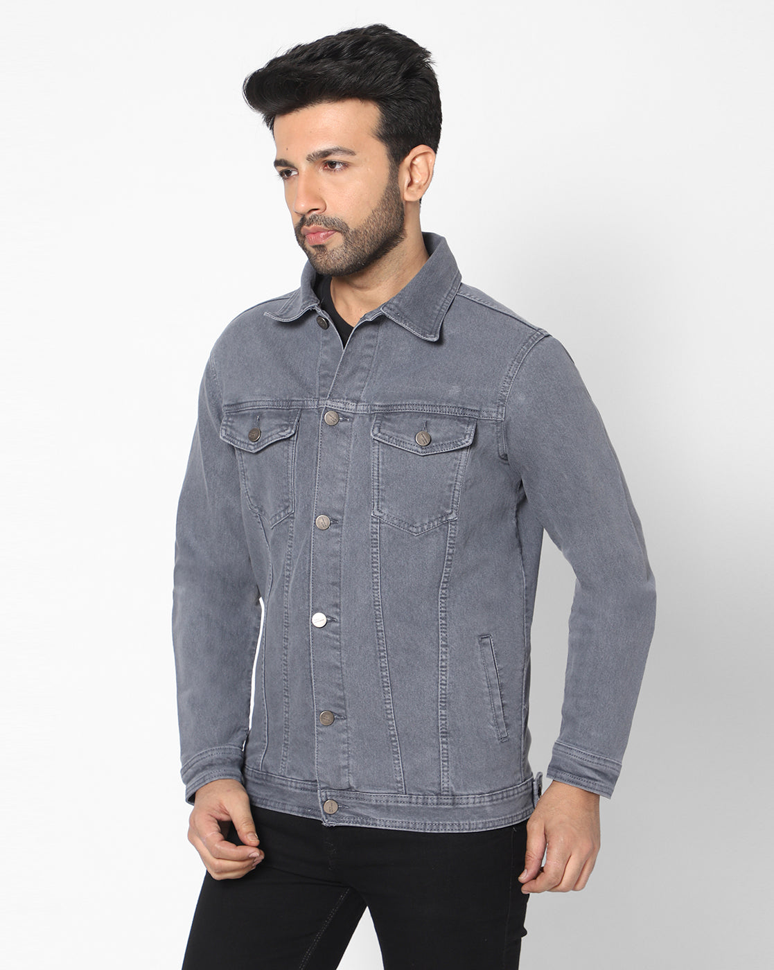 Stay stylish and comfortable with our Men Light Gray Cotton Jacket. Made with a stretchable fabric for maximum mobility, this regular fit jacket features a shirt collar, two folded pockets, and two side pockets. Perfect for any occasion, this denim jacket will keep you looking sharp and feeling great.