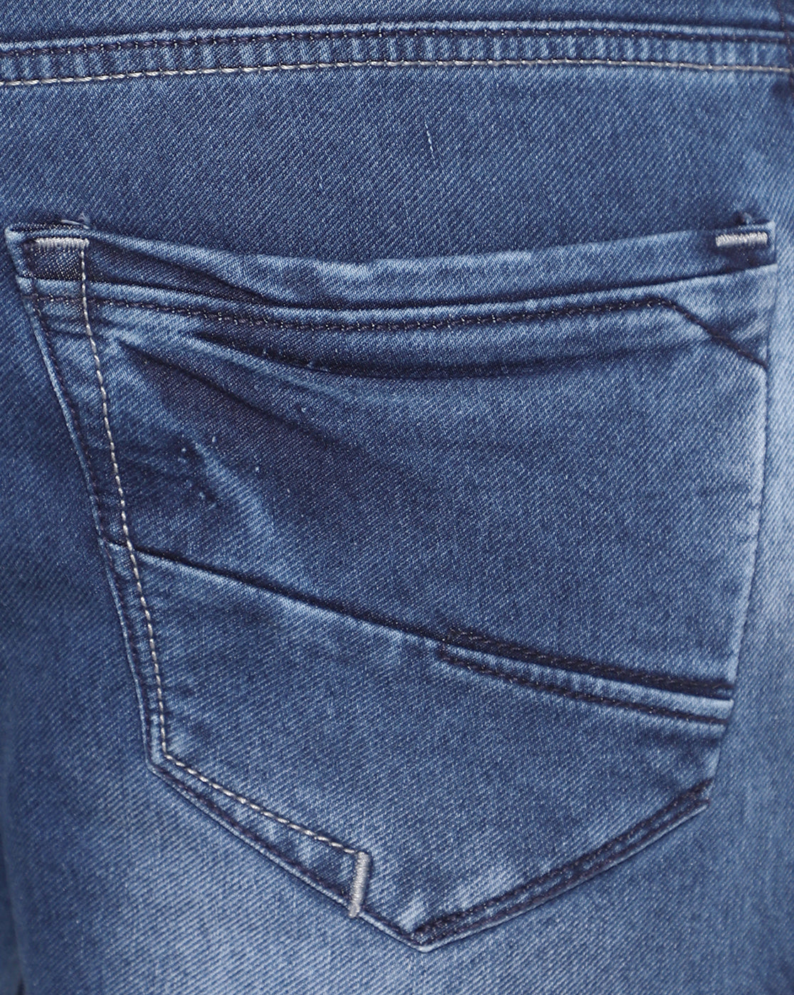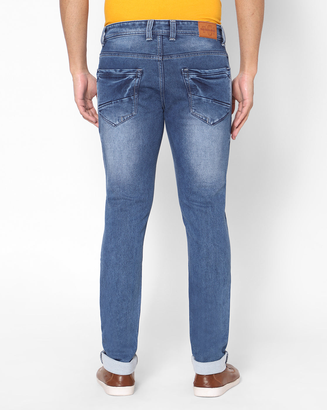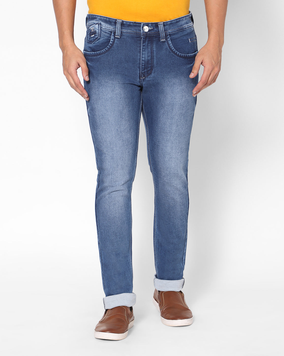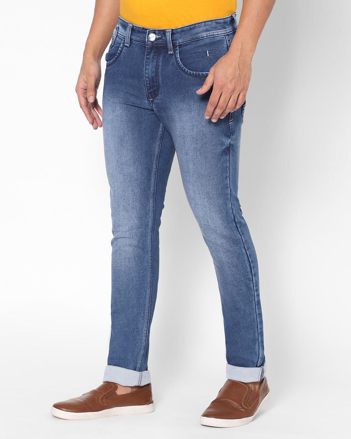 Elevate your fashion with our Men Mid blue knitted cotton jeans. Its utility-driven design offers multiple pockets, zipper fly, and button closure. Made from premium quality stretchable fabric, these jeans are comfortable and durable. The light faded (Spray Wash) adds a touch of style. Perfect for both casual and semi-formal occasions.