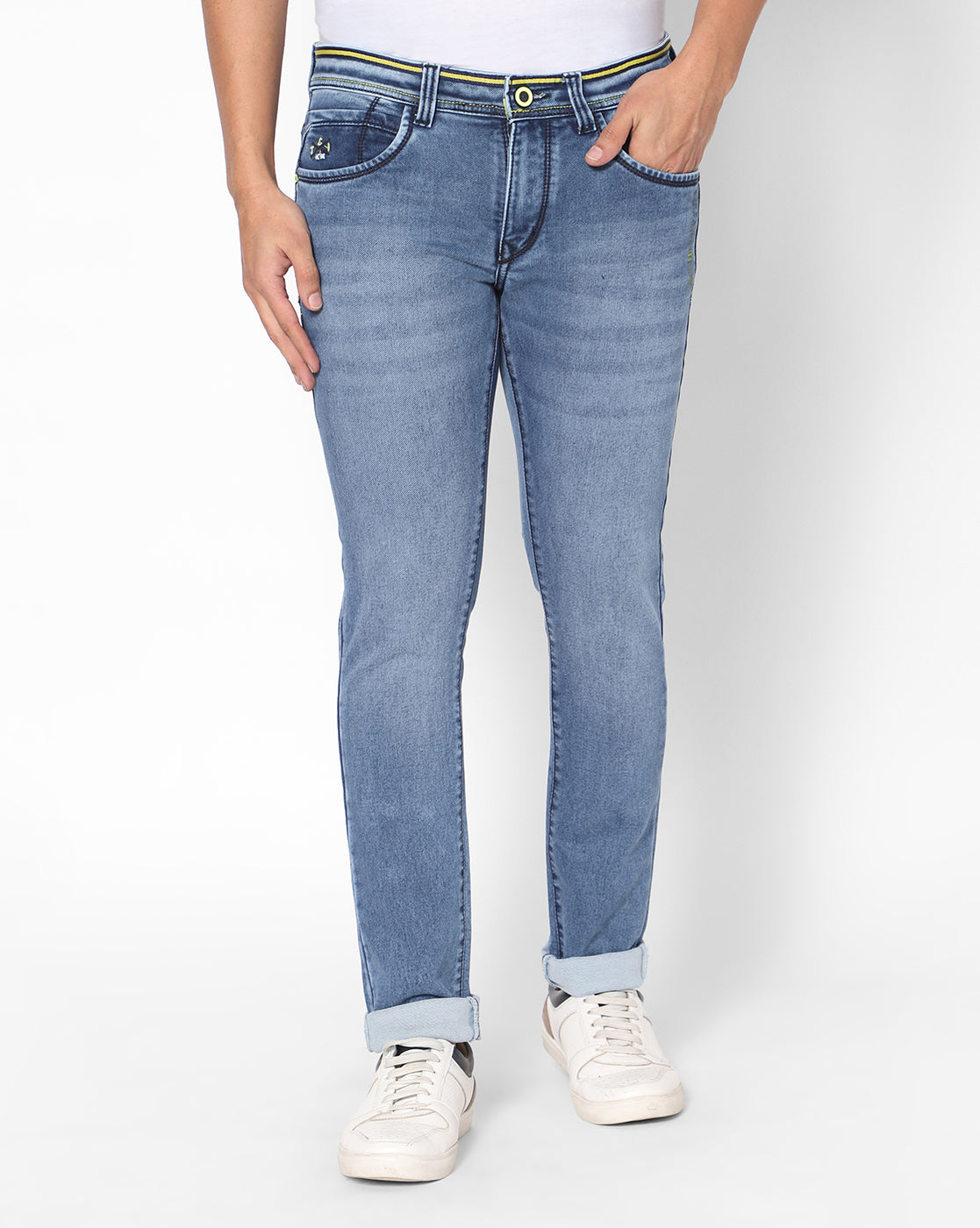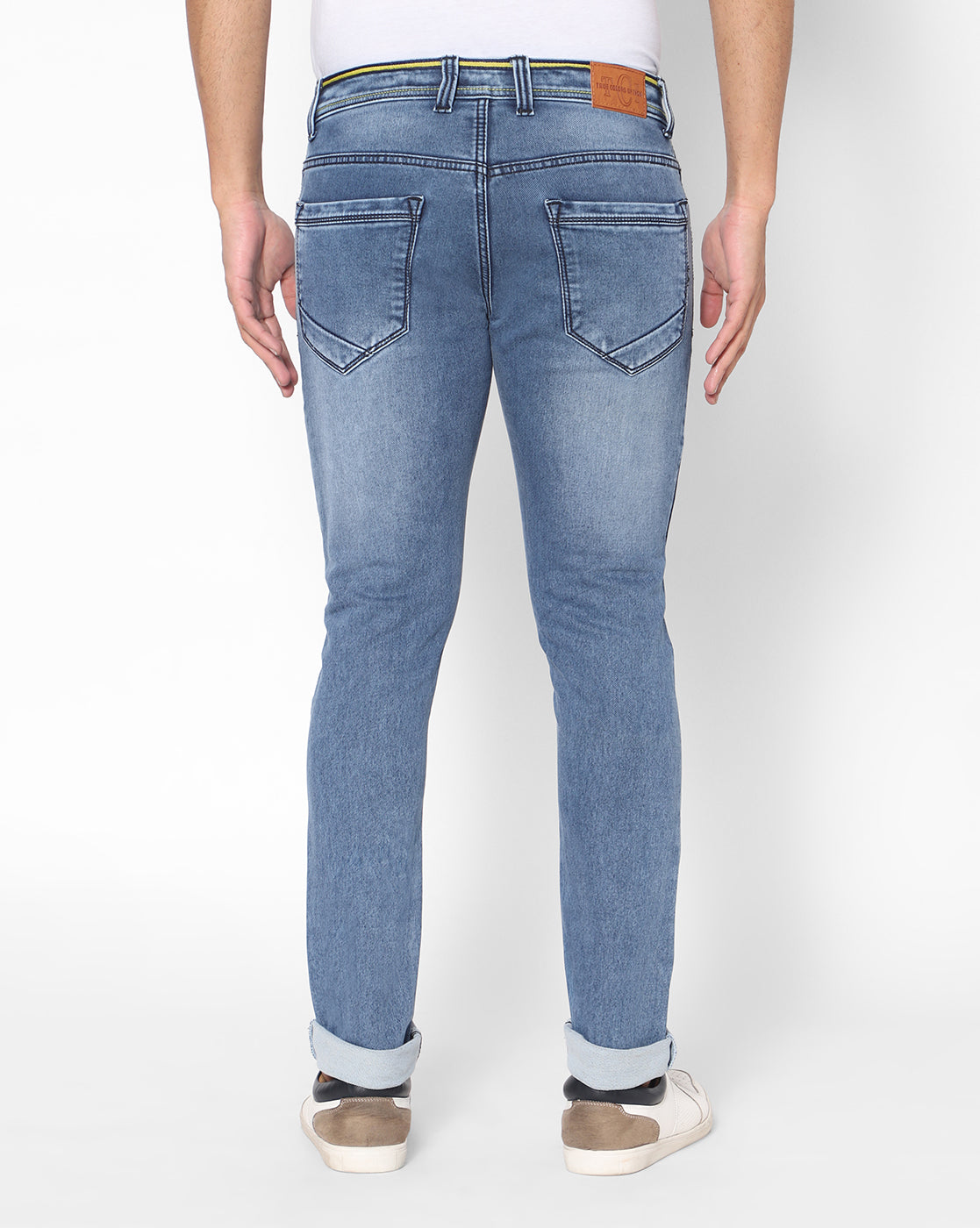 Introducing our Men Mid Blue Knitted Cotton Jeans for ultimate style and comfort. The regular fit and belt pattern make for a versatile addition to your wardrobe. With multiple pockets, zipper fly, and button closure, these jeans are both functional and stylish. Crafted from premium cotton knits, they are perfect for any occasion.