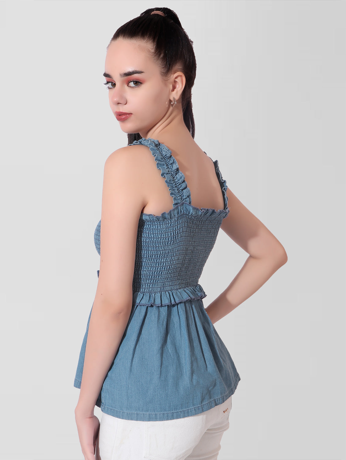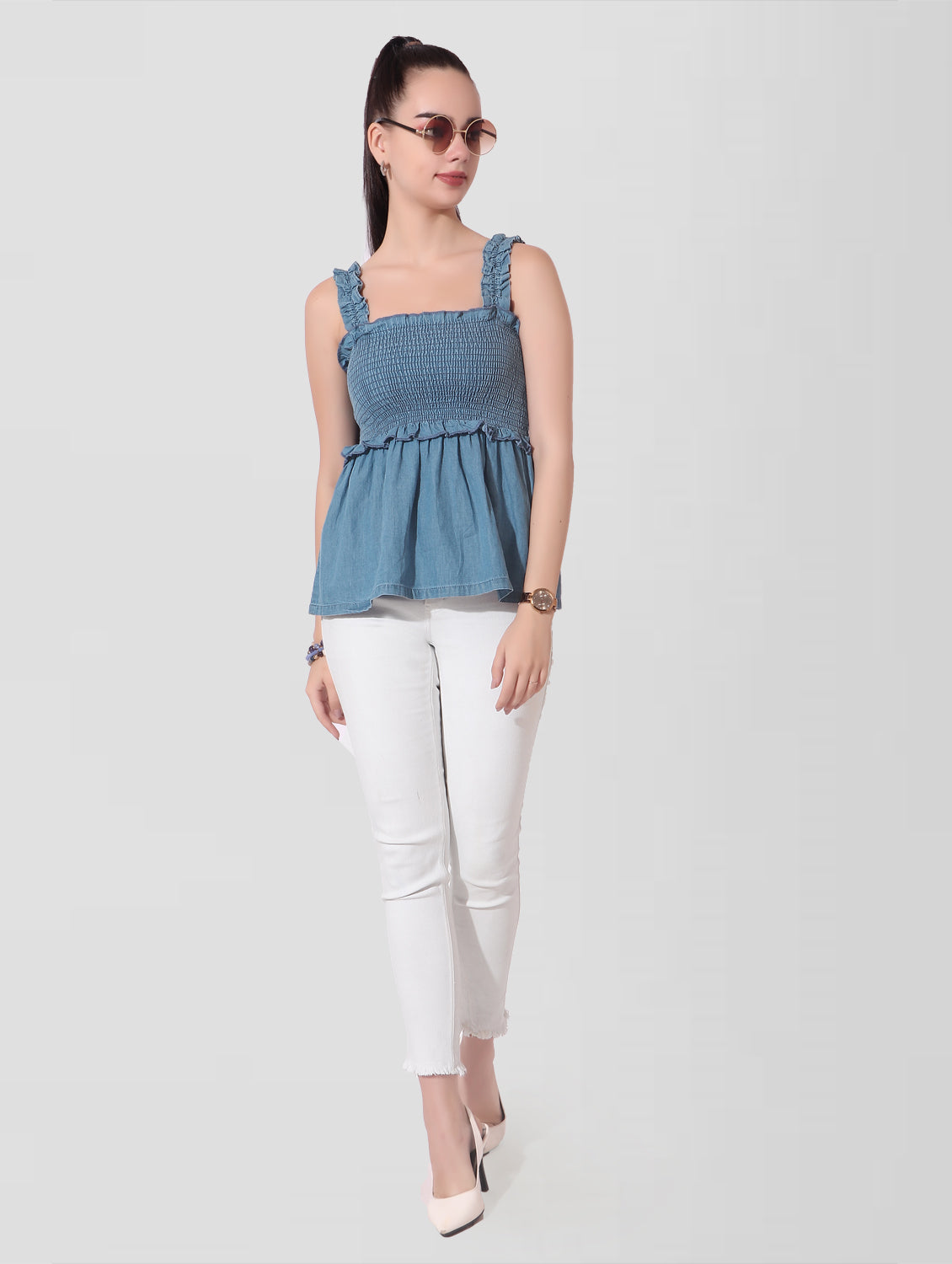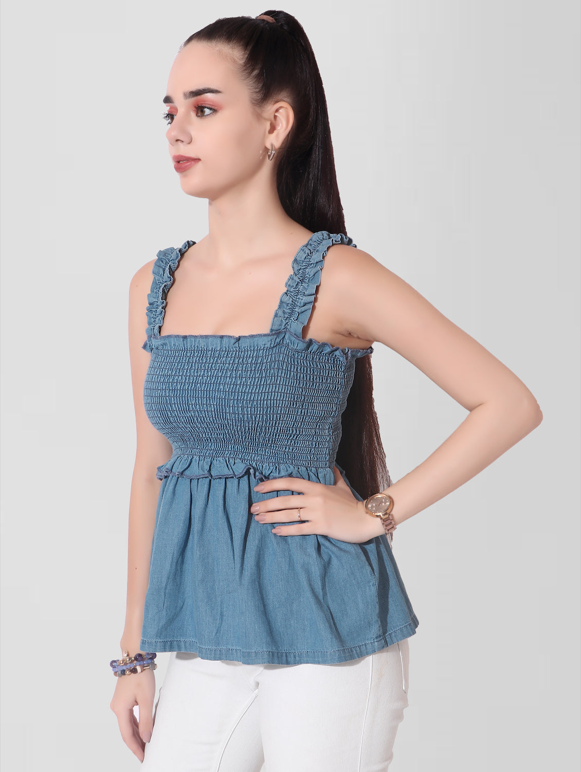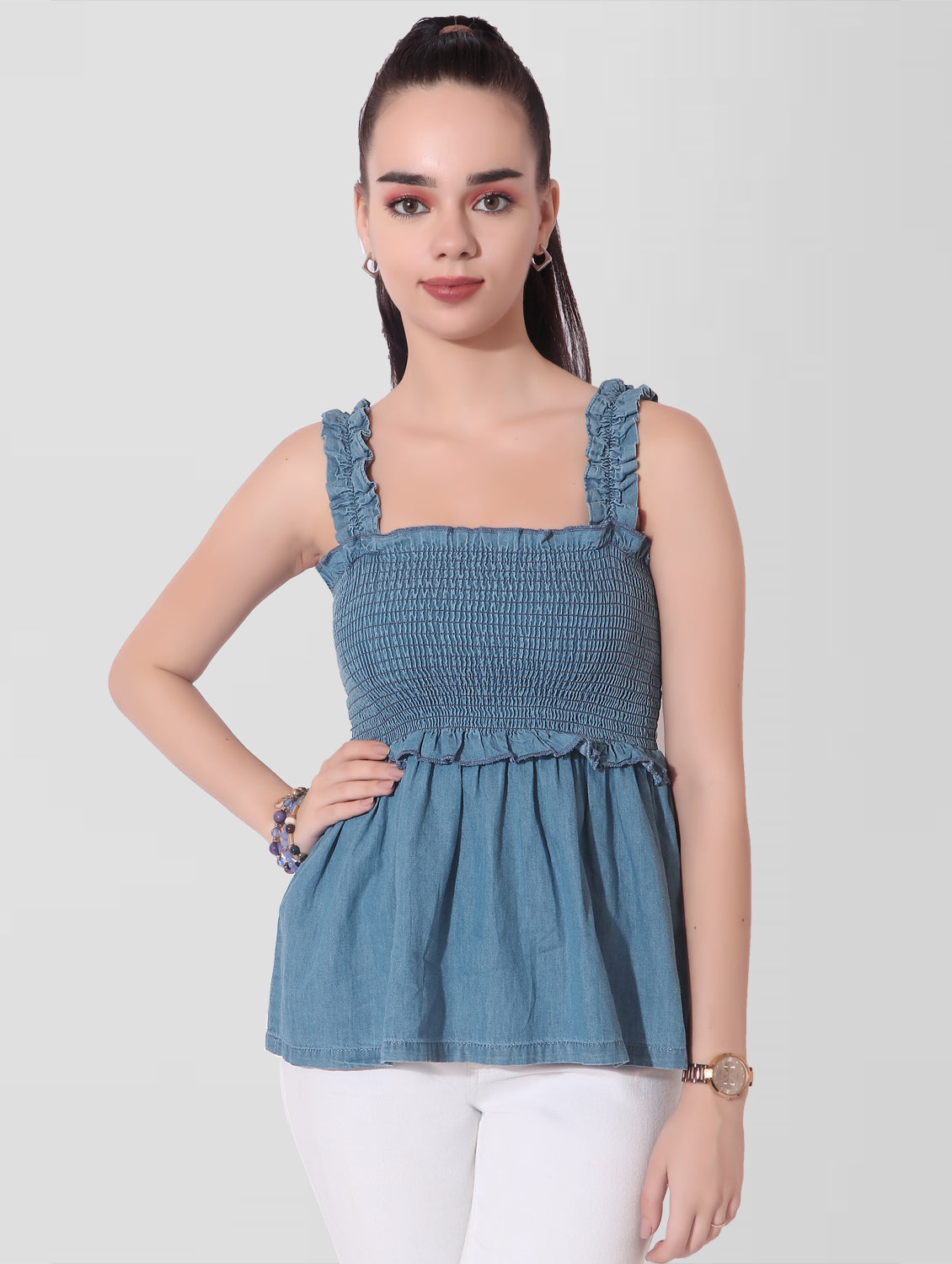 Cefalu®️ Women Blue Denim Smocked Sleeveless Top