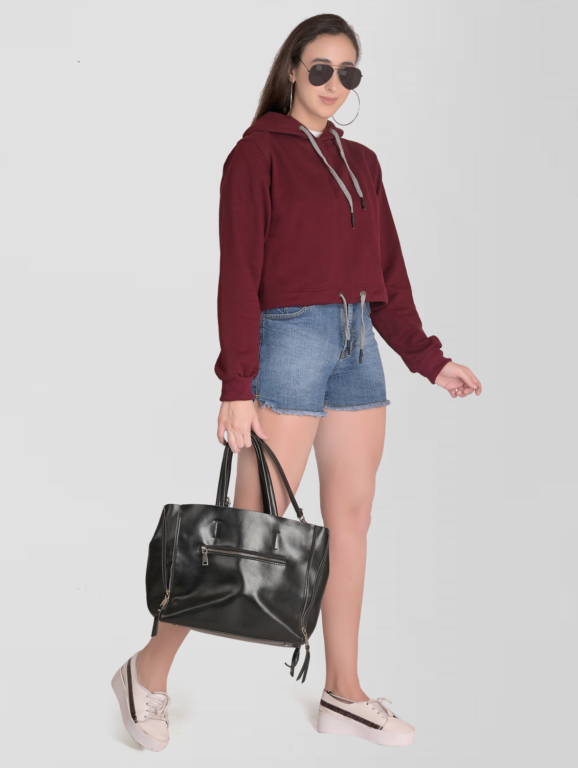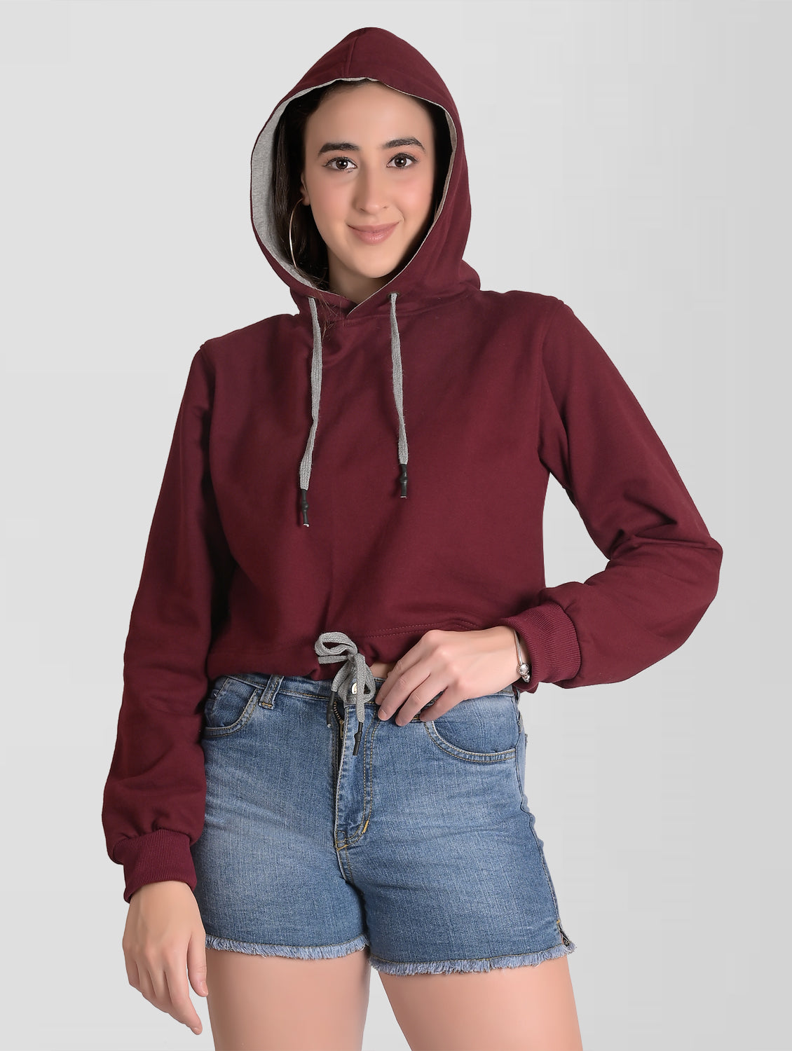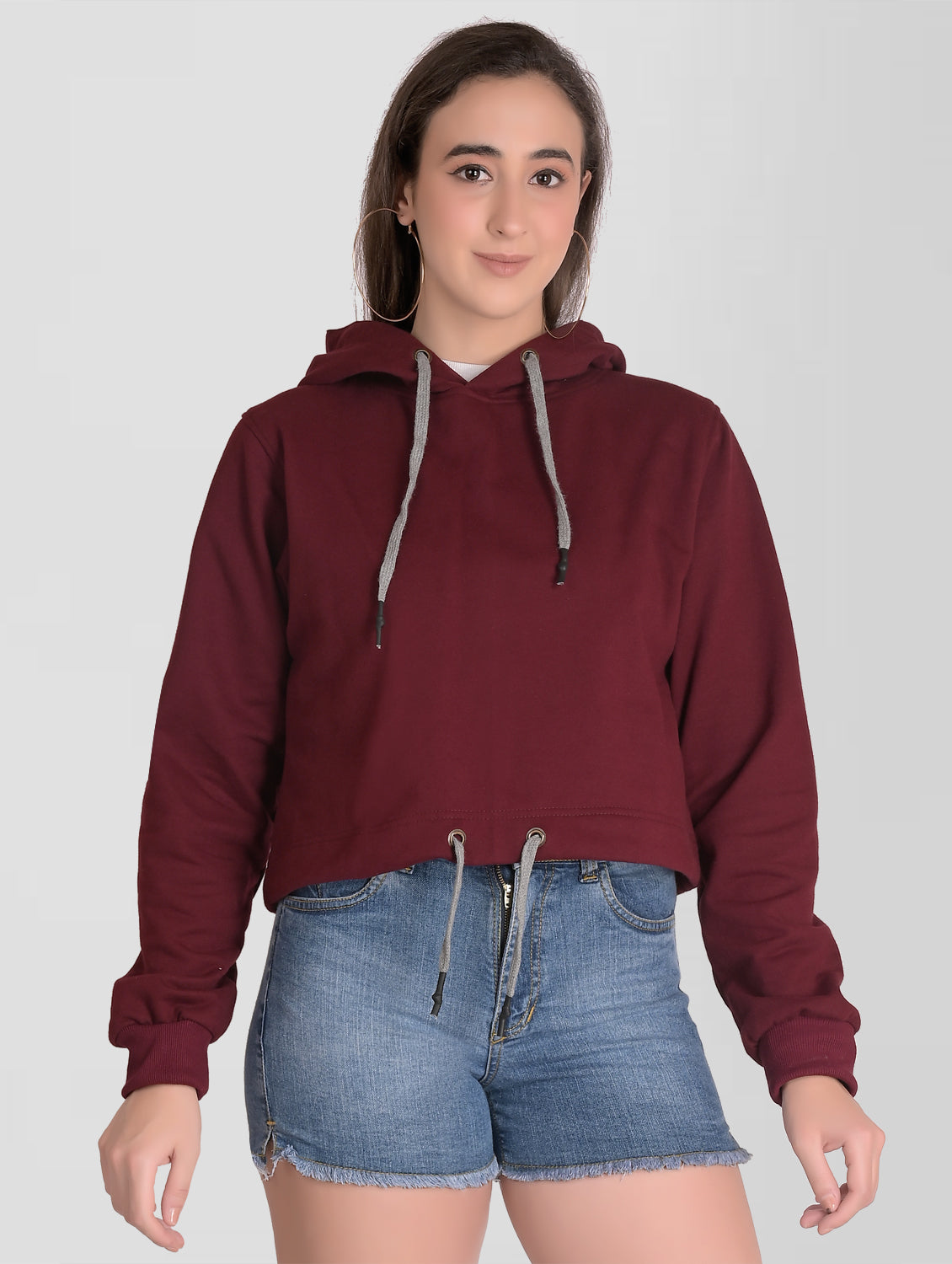 Stay warm and stylish with our Women Burgandy Cotton Hoodie. This regular fit hoodie features a stretchable fabric, full sleeves, and a fully covered hood to keep you protected from the chill. With its solid burgundy color and two pockets, it's the perfect addition to any casual outfit.