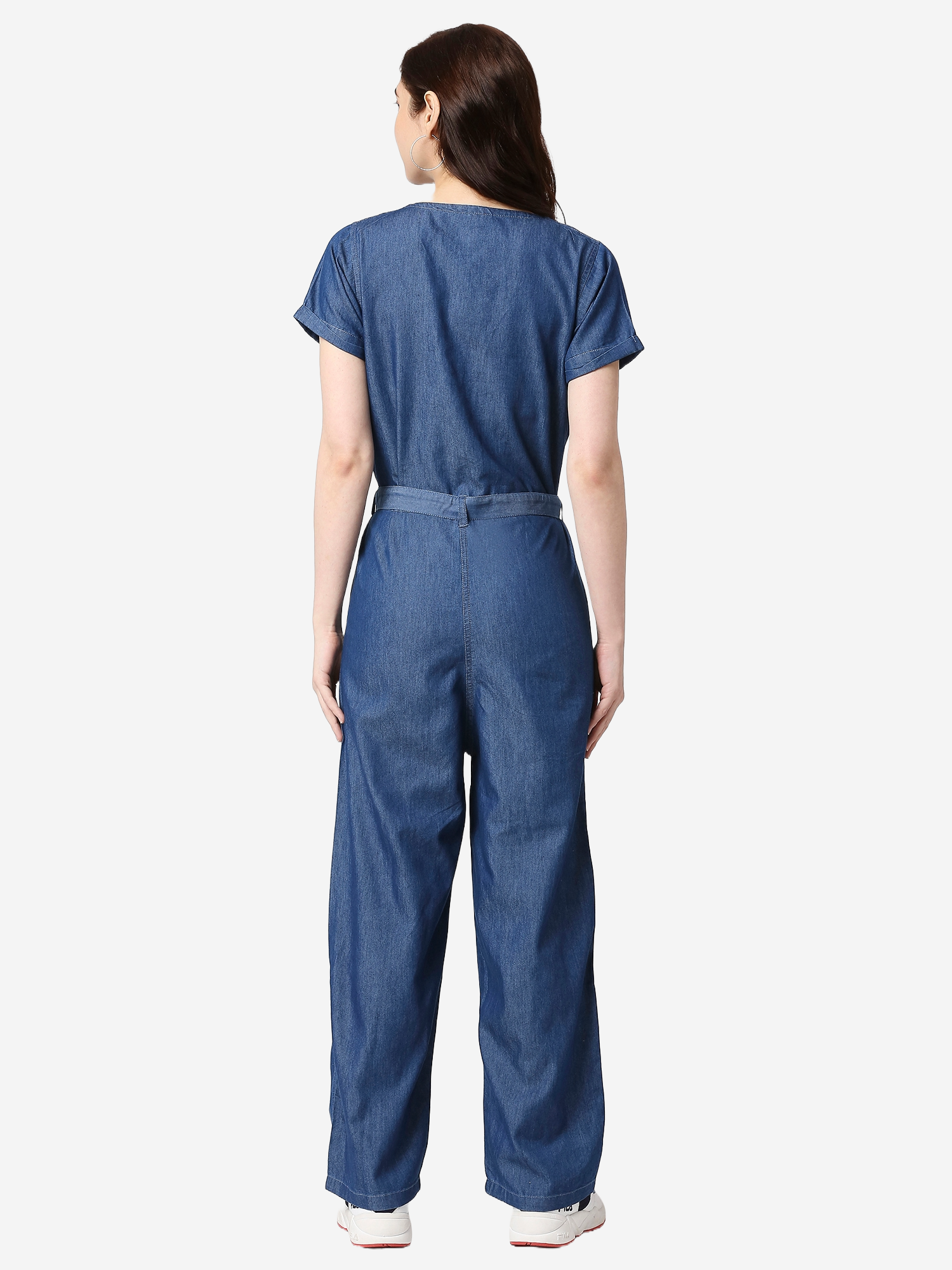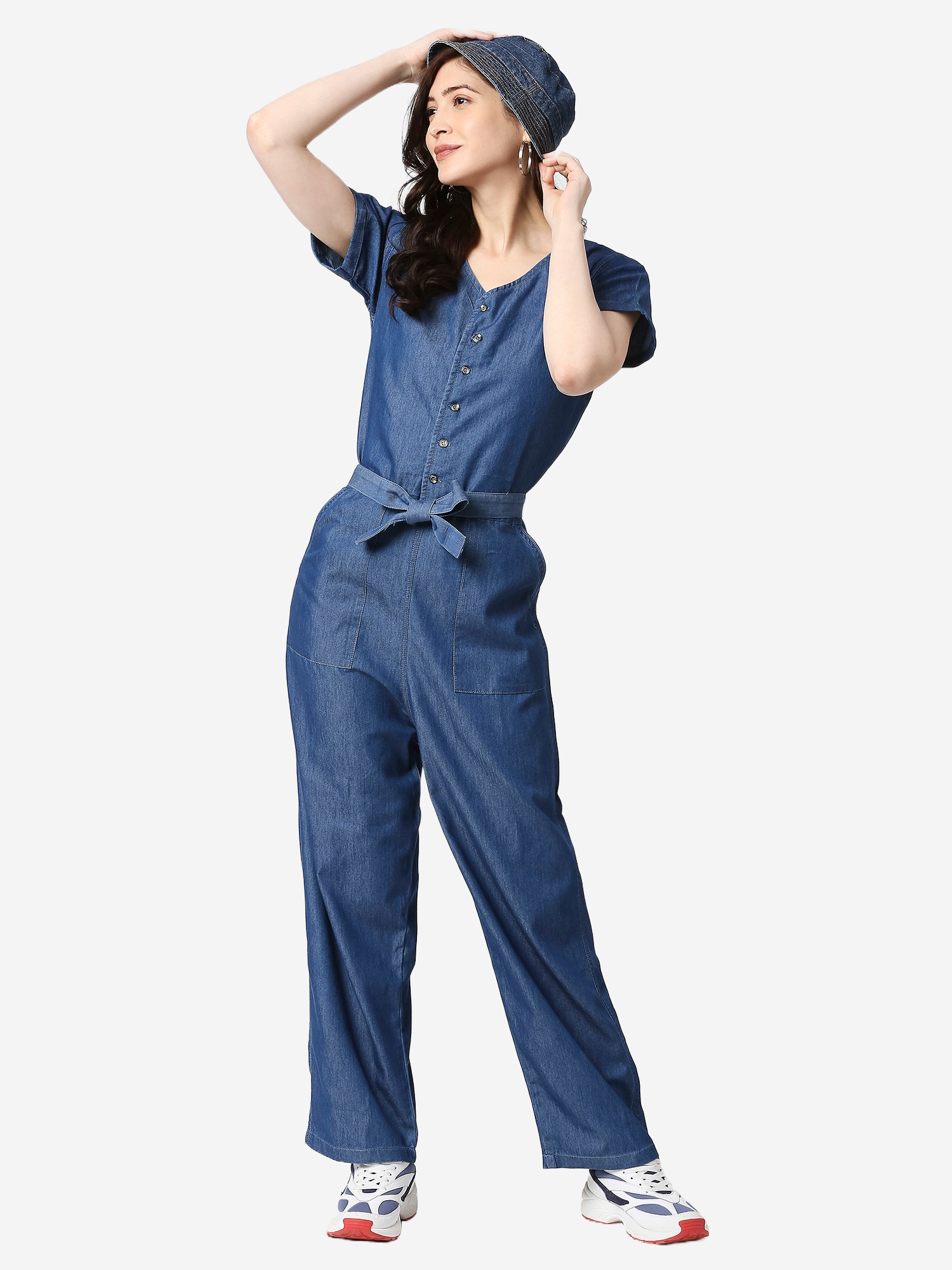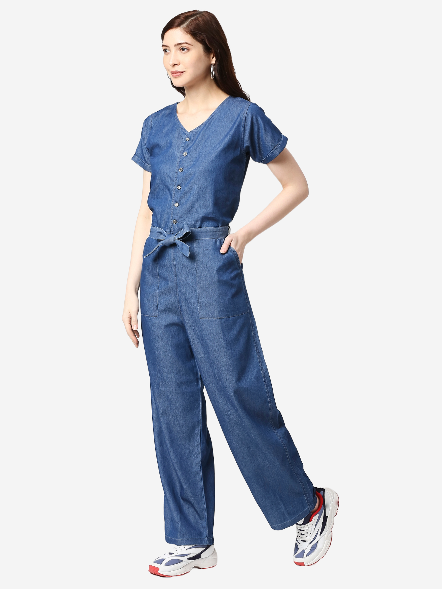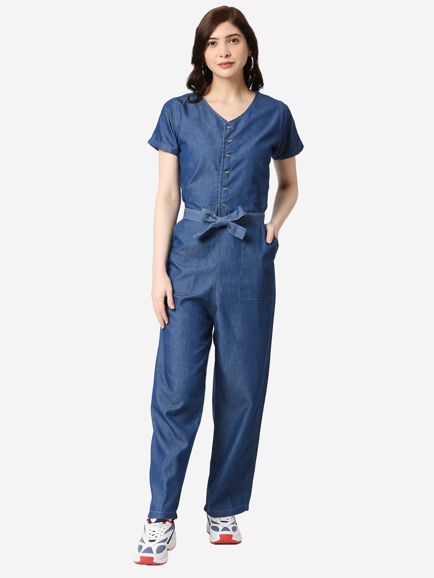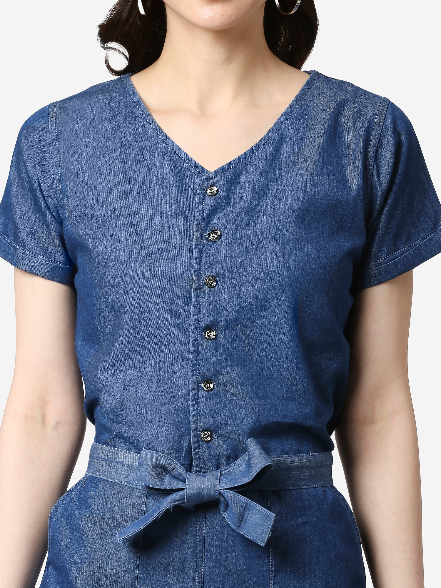 Introducing our Cefalu Women Denim Blue Cotton Jumpsuit, perfect for a stylish day out. Made with solid fabric, short sleeves and a V neck, it features a contemporary design with a light blue detailing and a comfortable regular fit. This readymade jumpsuit comes with a belt and two pockets, making it practical and trendy for all seasons. Upgrade your wardrobe now!