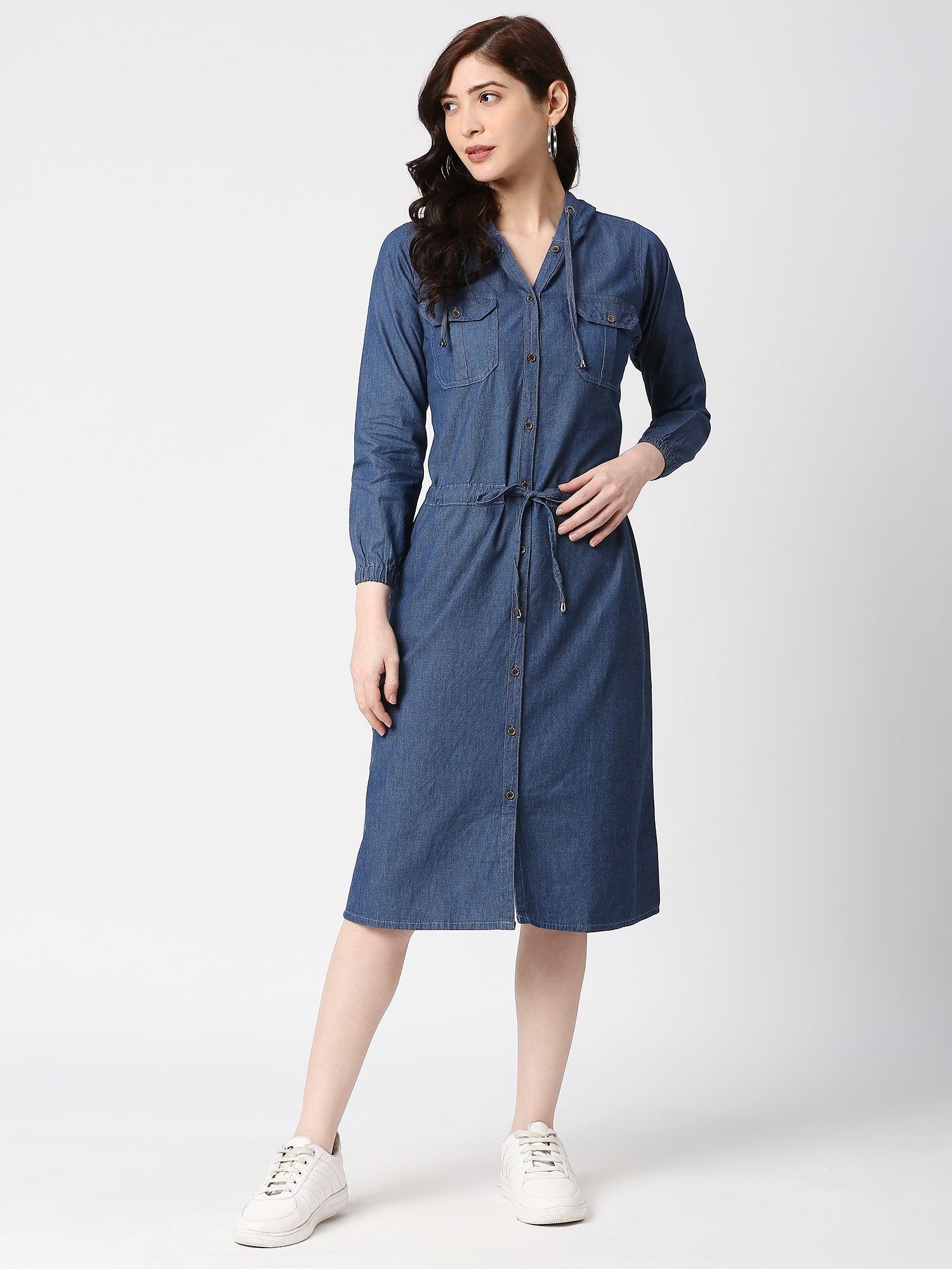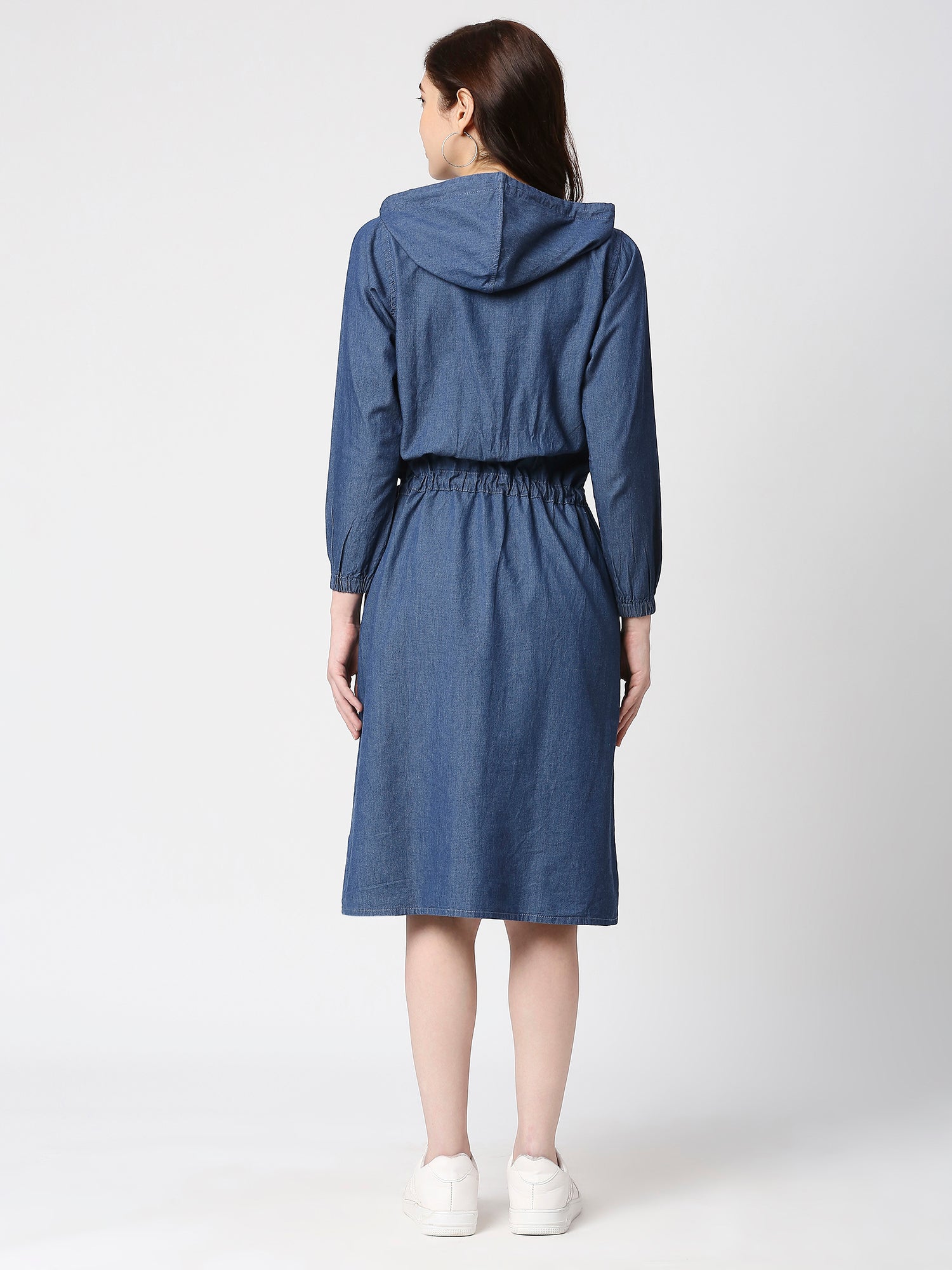 Discover the perfect blend of comfort and style with our Women's Denim Hooded Dress. This regular fit dress features a hooded neck with a hooded cap and front pockets, making it the perfect option for a casual yet stylish look. With its knee length and full sleeves, this solid blue dress is a must-have for any fashion-forward wardrobe. Make a statement with our Women's Denim Hooded Dress.