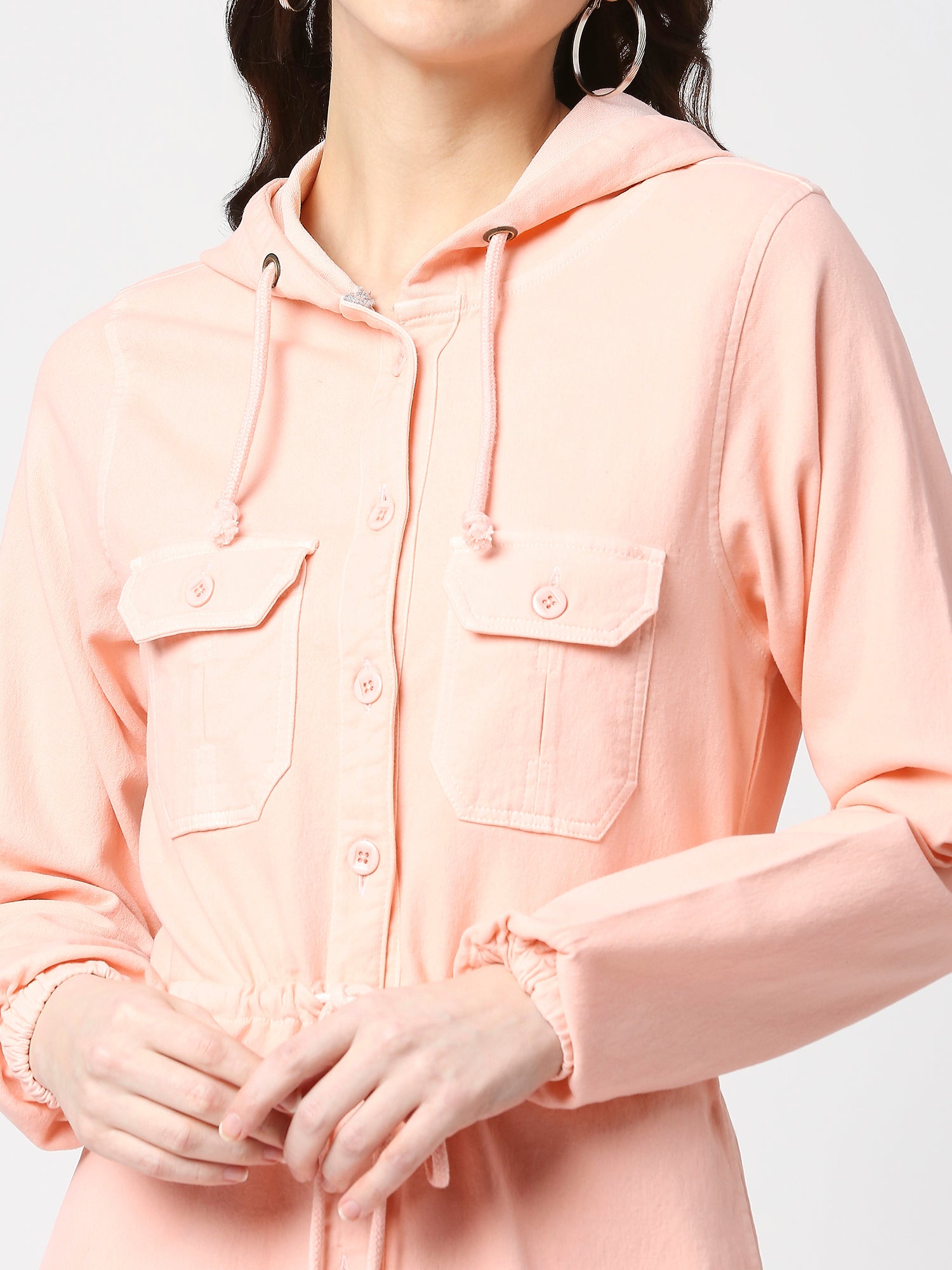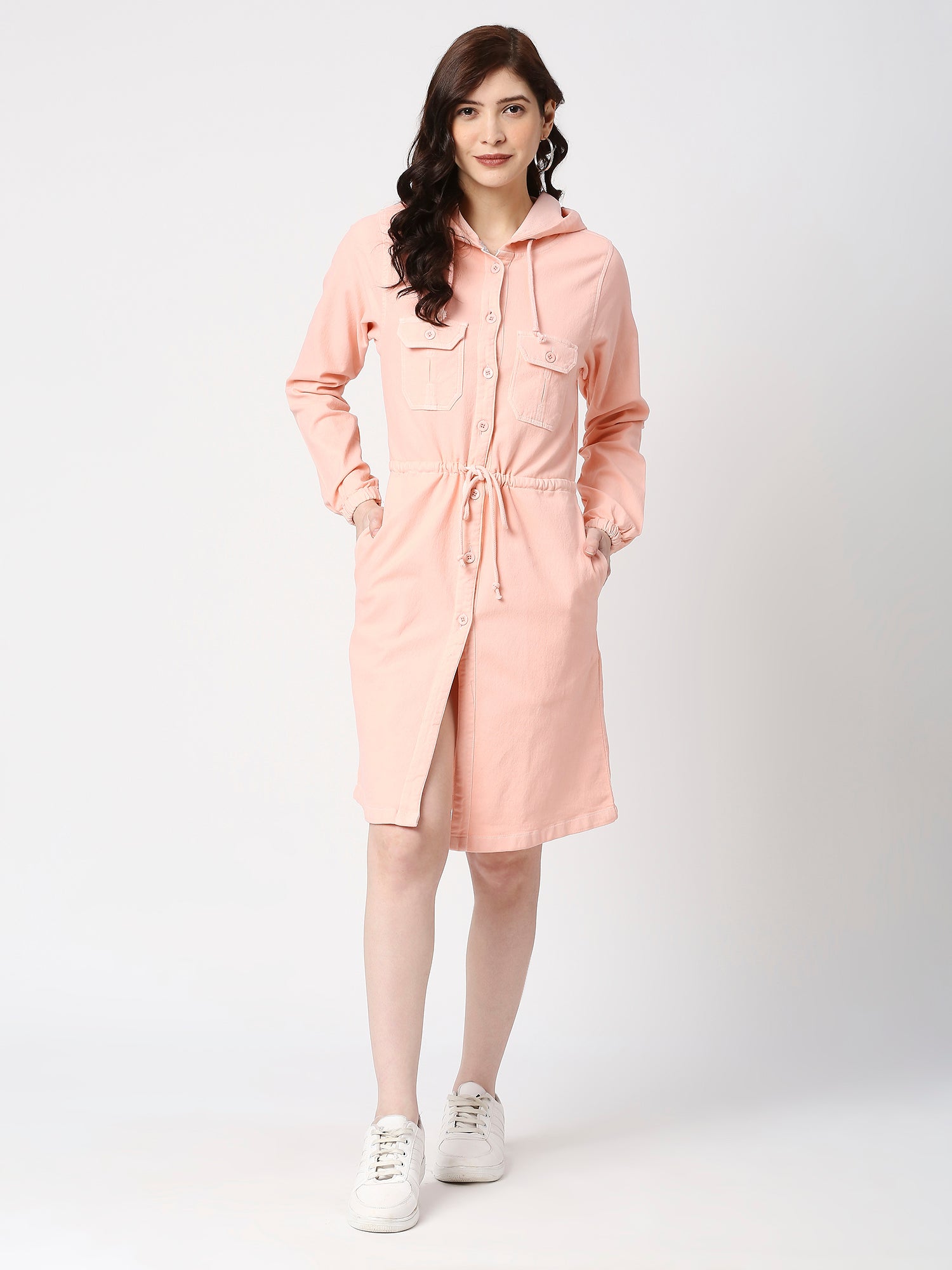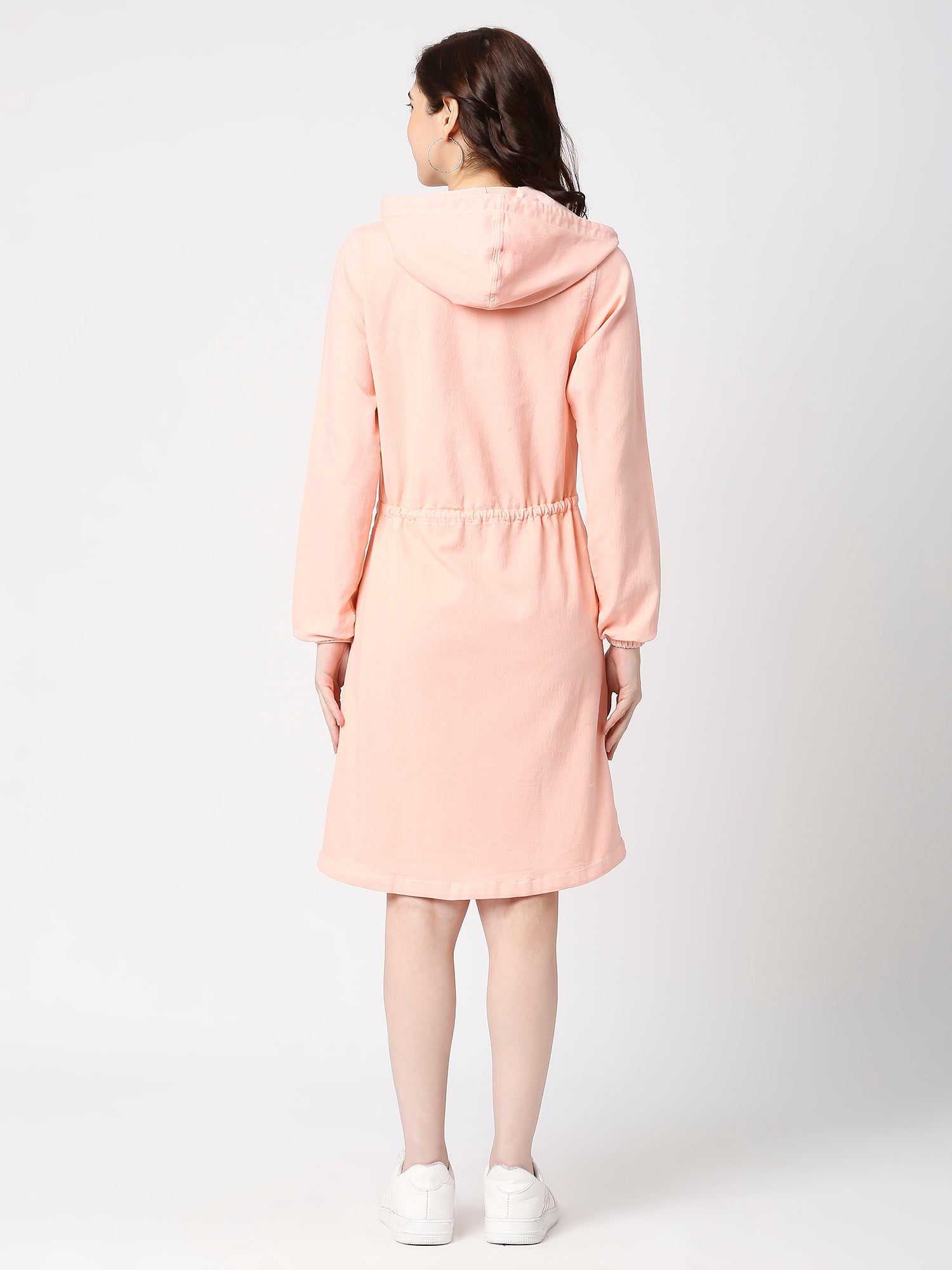 Upgrade your wardrobe with this Women Denim Pink Hoodie Dress. Made from comfortable Acru Denim cotton, this dress features a stylish hooded neck, full sleeves, and stretchable fabric for a perfect fit. The knee length dress in a beautiful pink color will surely make a statement. Perfect for any occasion, it comes with two front pockets for added convenience. Stay trendy and comfortable with this must-have hoodie dress.