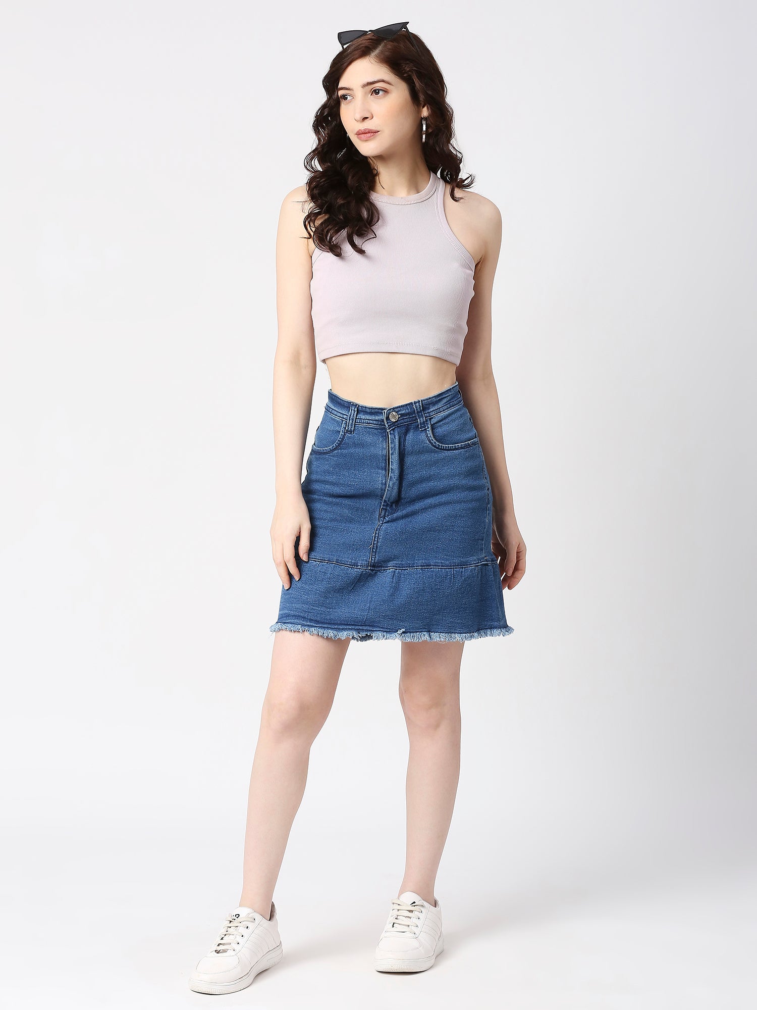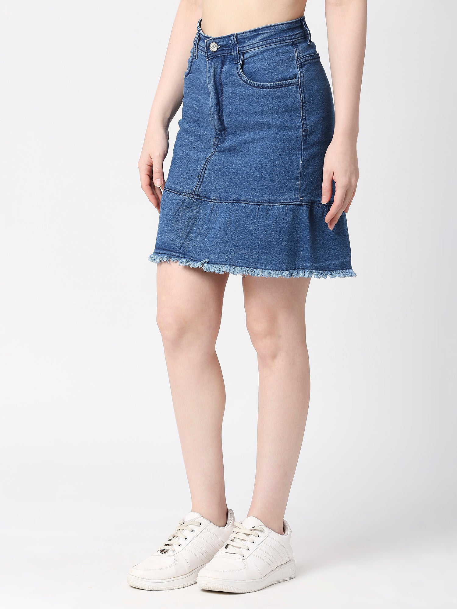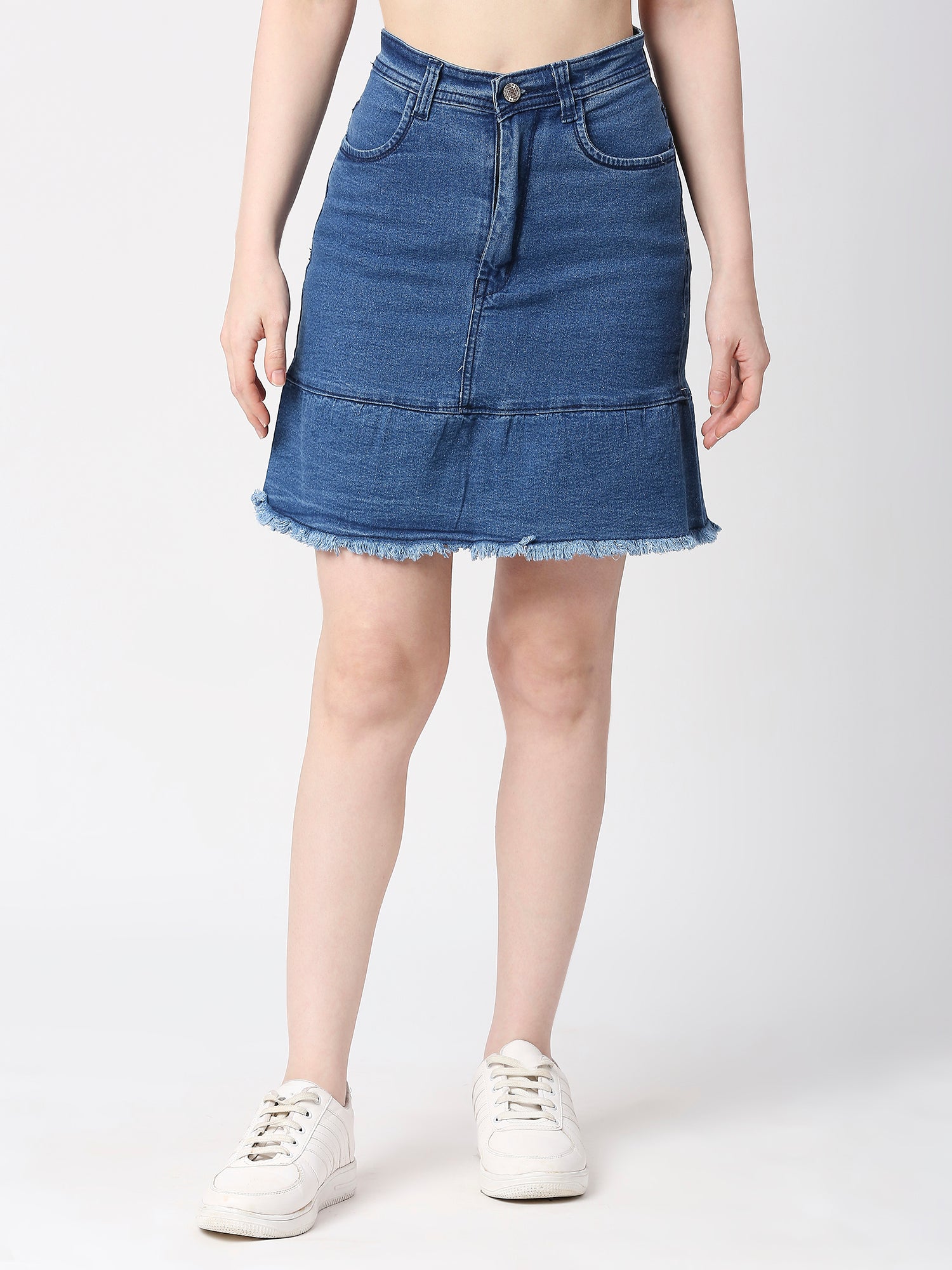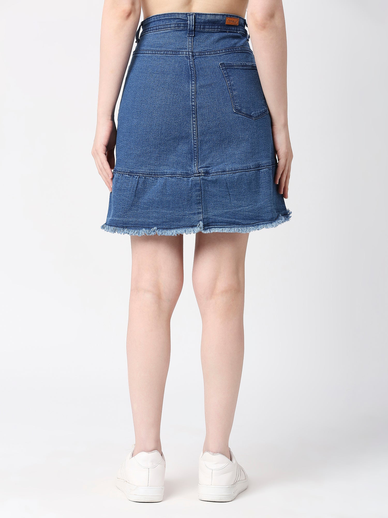 Cefalu®️ Women Light Blue Denim Cotton Raw edge Skirt