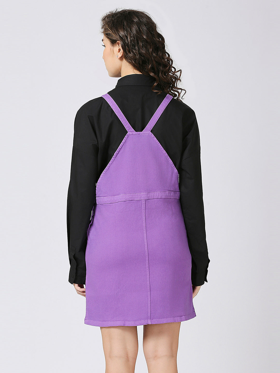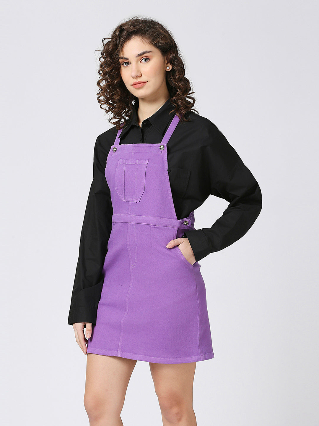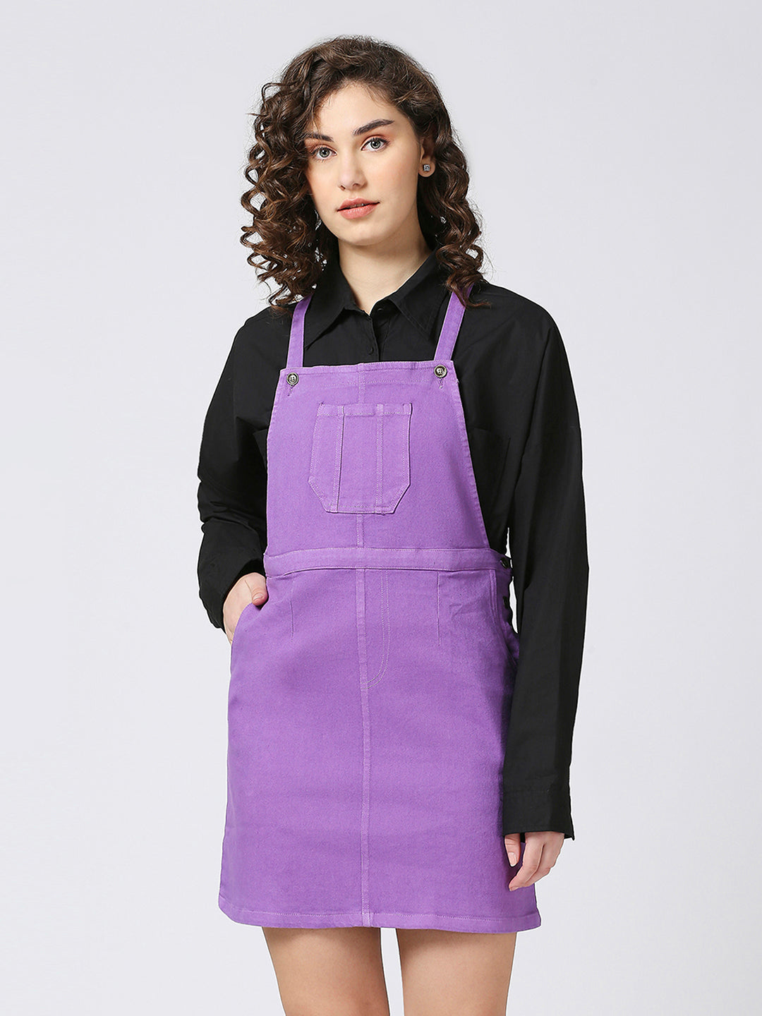 This Women Purple Denim Dungree Skirt is a versatile and stylish addition to your wardrobe. Made from quality denim, this skirt features an adjustable belt and above knee length for a perfect fit. With side slit and front patch pockets, it offers both functionality and fashion for the modern woman.